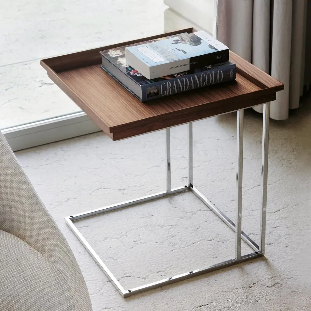 Side table Takahara chrome with solid brass base in brushed finish and with solid walnut wood tray.