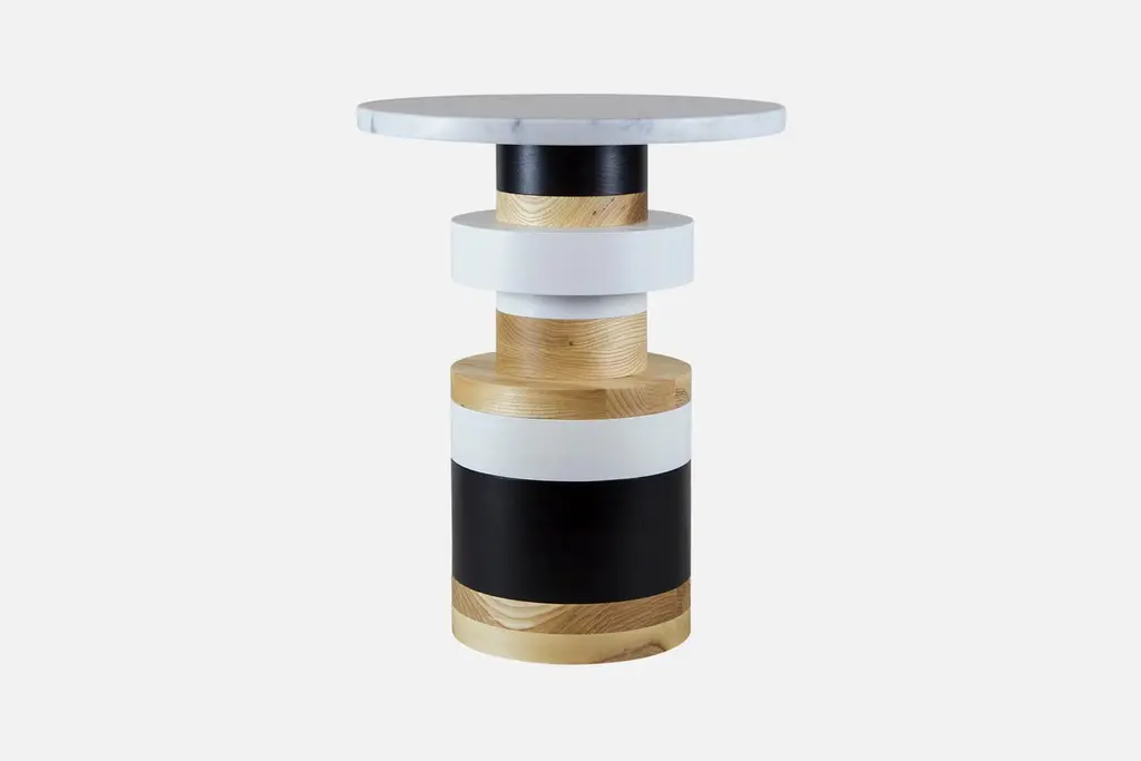 The Sottsass-inspired “Sass Tables” are simple, sculptural accents for any interior space. Made from stacked wooden bases and a honed marble top, Sass tables are perfect individually or clustered. Measures: 20 inches tall with 18 inch marble top.