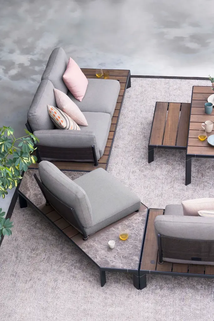Tami seating system by Patrick Norguet has a basic structure made from two special 6060 aluminum alloy profiles and details in AISI316 stainless steel. The special profiles were designed to allow the support surface slats to be fitted using an interlocking system. The slats are made in Bamboo or WPC, a composite of recycled bamboo wood and fibers; an eco-friendly material that is resistant to water, atmospheric agents and bacteria, easy to clean and 100% recyclable. Special injection-molded nylon parts are used to assemble backs and armrests, made from D28 tubular and 30 x 8 plates in 6060 aluminum alloy. The fabric parts of the armrests/backrests are made from 100% Polypropylene Outdoor Limonta, and the seat padding is in polyurethane foam with a 100% cotton fabric inner lining with water repellent treatment. The collection consists of: lounge chair frame, 2 seater sofa, 3 seater sofa, angular frame and low table in 2 versions.Available colours:Frame: White, Black Top of the Frame: BasaltinaTop of the angular frame gres: statuario whiteSlats structure: WPC/Antracite and BambooCushions: Basic fabrics (all) Standard Fabrics (all) Premium fabrics (all except: corsica, grayscale, harlequin, striped polo, lavender)
