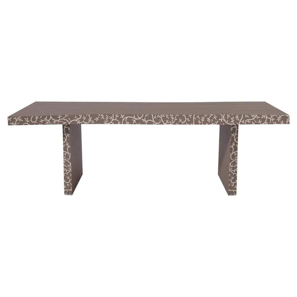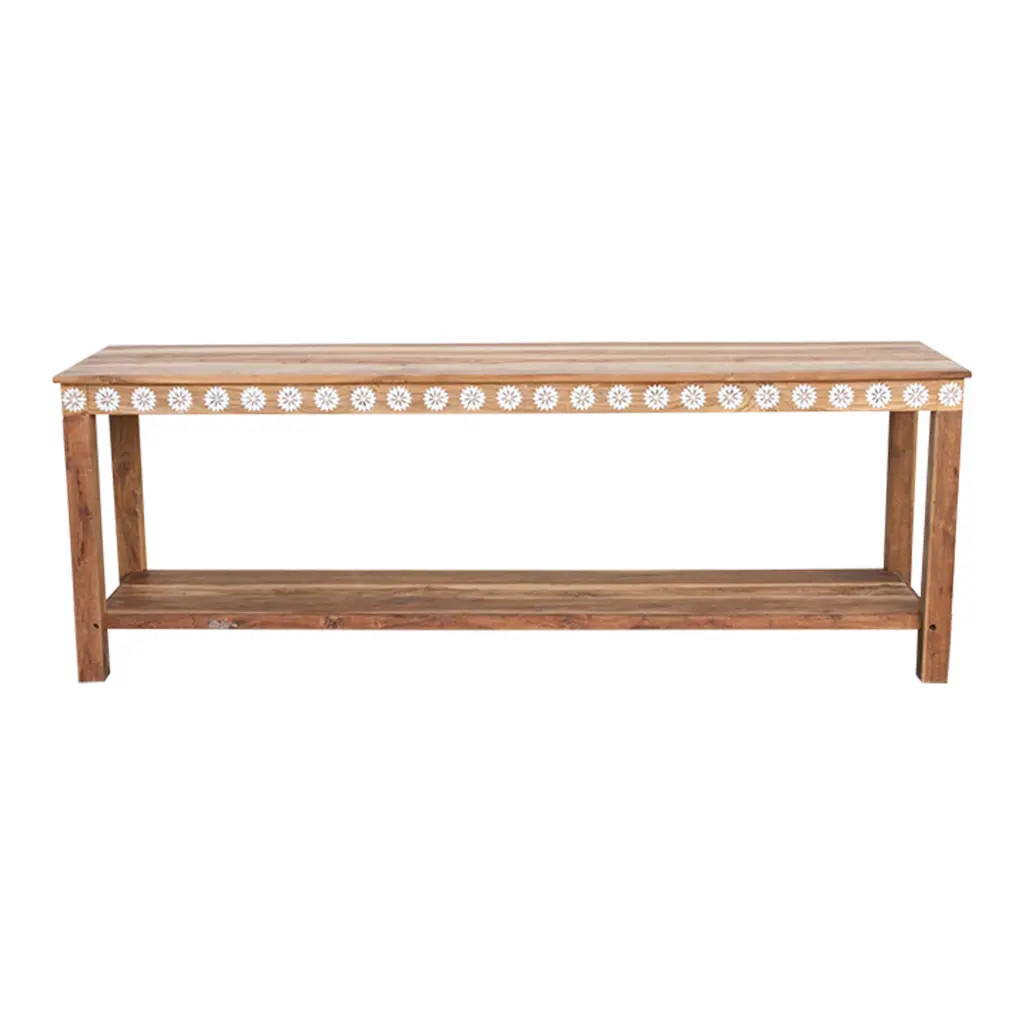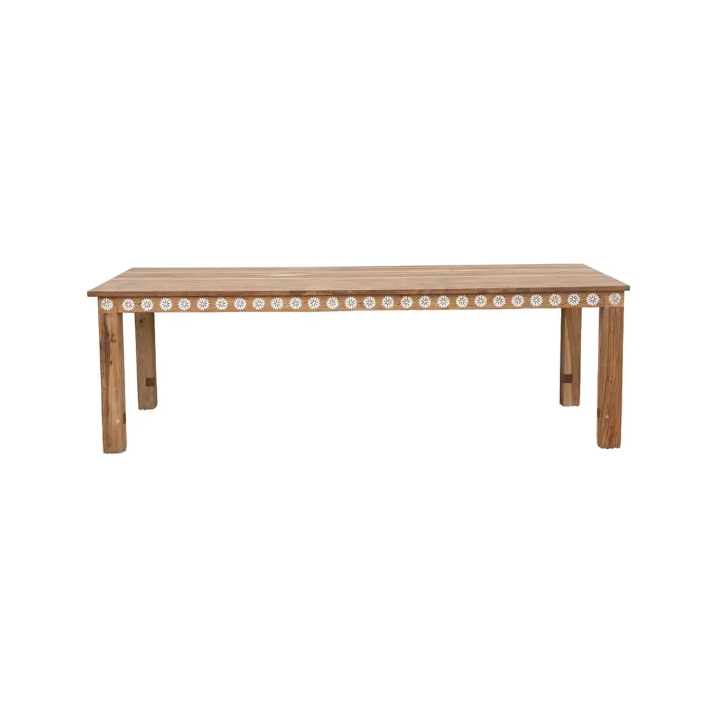 Our Tamsin collection is expertly crafted to elevate the beauty and comfort of your indoor space, creating a sanctuary of inspiration. Solid teak features an intricate bone inlay pattern on the tabletop, apron, and legs. The natural beauty of teak ensures that no two pieces are exactly alike - variations in color and tone are to be expected.