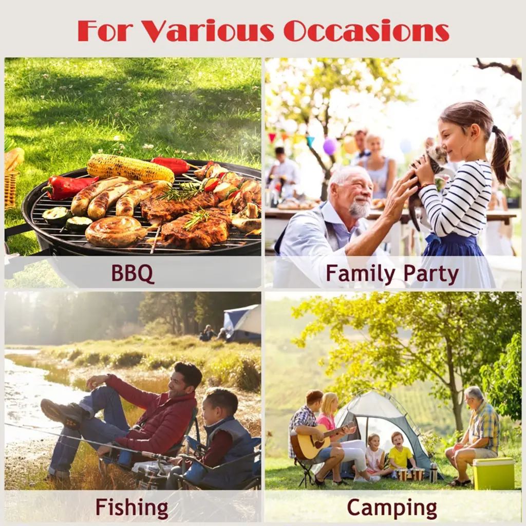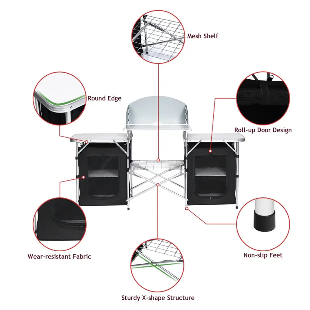 Chose our camping kitchen table for various outdoor activities! With the foldable design and carrying bag, this outdoor cooking table can be easily carried wherever you want, such as camping, picnic and outdoor party, etc. When you arrive at the desired place, just unfolding in a few minutes. Furthermore, the heavy duty aluminum and steel frame endow the strong loading capacity. Meanwhile, there are multiple storage spaces. Therefore, you are able to put a lot of food on this portable folding cooking table. What’s more, the practical windscreen and 2 zippered organizers with breathable mesh create a perfect cooking environment while bringing the perfect storage spaces to keep delicious foods.FeaturesPerfect for preparing food and storing them because of the large storage spacePractical windscreen to keep heat retention and effective burningMake the camp table multifunctional with detachable windscreenHeavy duty aluminum and steel frame for strong bearing capacity up to 210 lbsSturdy X-shaped structure and anti-slip foot pads for additional stabilityEnsure long time outdoor use with premium oxford fabric and MDFEasy to move and carry thanks to the foldable design and carrying bagSuitable for camping, picnic and backyard party, etcBetter ventilation and protection for inner foods due to 2 zippered organizers with breathable meshRound edge design for safe protectionConvenient to clean to look brand newReady to use with simple and quick installationSpecification: Color: Gray/Black Material: Aluminum, Steel, Oxford Fabric, MDF Overall Dimension of Unfolding: 68” x 19” x 43.5” (L x W x H)/174 x 47.5 x 110.5 cm (L x W x H) Overall Dimension of Carrying Bag: 31” x 19” x 5” (L x W x H)/78 x 49 x 14 (L x W x H) Size of Aluminum Tabletop: 26” x 16” (L x W)/67 x 40.5 cm (L x W) Size of Each Side Tabletop: 24” x 15.5” (L x W)/60 x 39 cm (L x W) Size of Grid Shelf: 22” x 19” (L x W)/55 x 47.5 cm (L x W) Size of Each Inner Storage Shelf: 18.5” x 13” (L x W)/ 47 x 32 cm (L x W) Total Net Weight: 25 lbs/11.5 kg Weight Capacity of Aluminum Tabletop: 110 lbs/50 kg Weight Capacity of Each Side Tabletop: 22 lbs/10 kg Weight Capacity of Grid Shelf: 11 lbs/5 kg Weight Capacity of Each Inner Storage Shelf: 11 lbs/5 kg Package Includes: 1 x Camping Kitchen Table 1 x Carrying Bag 1 x Instruction