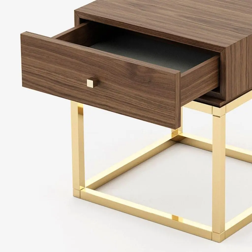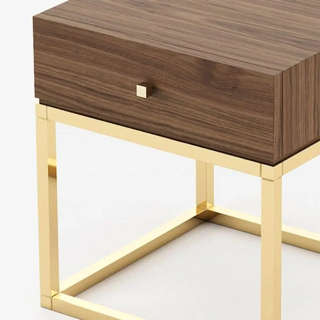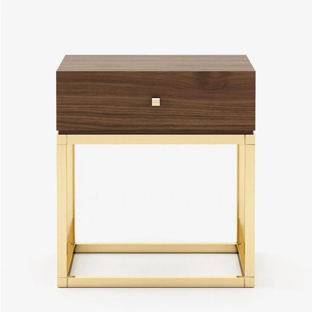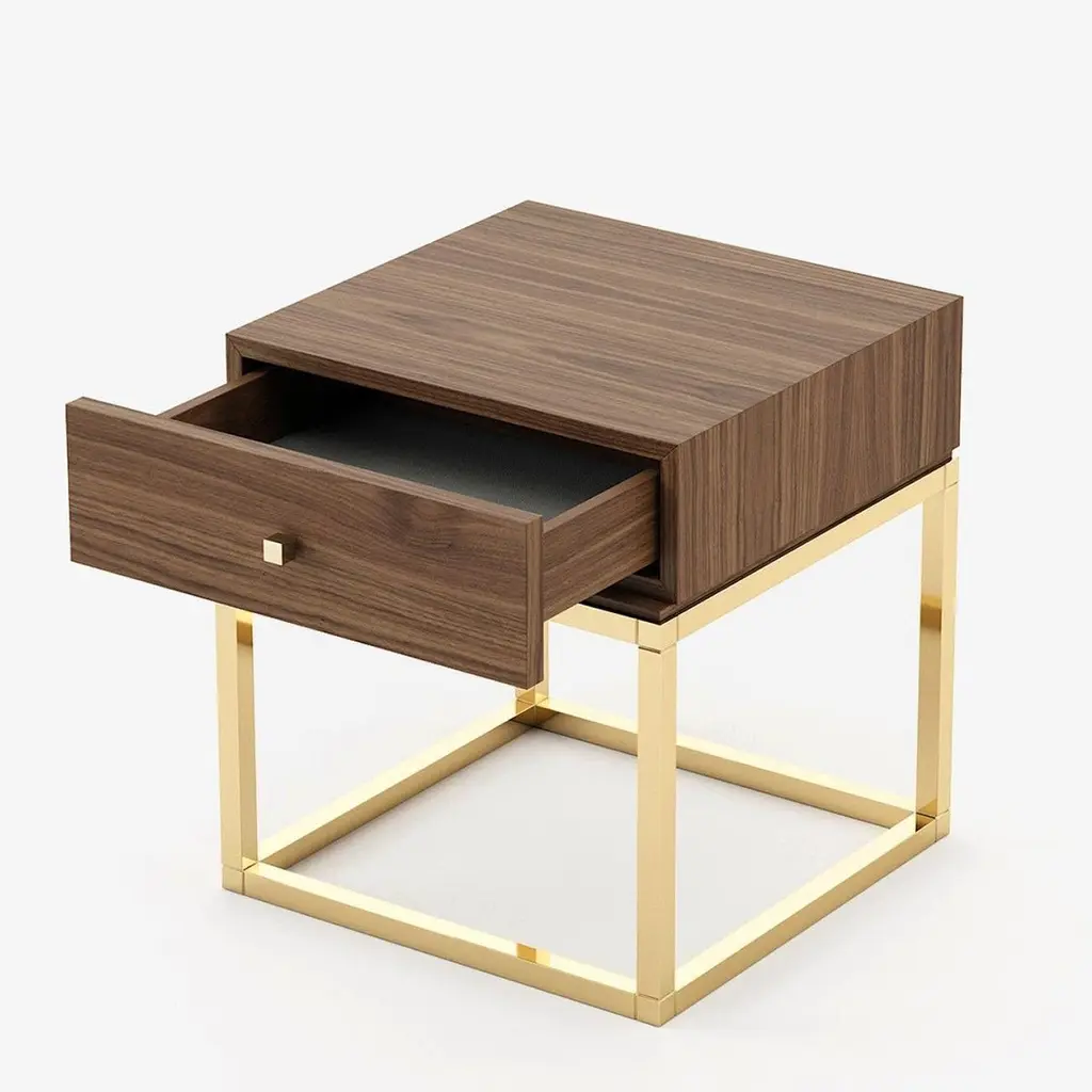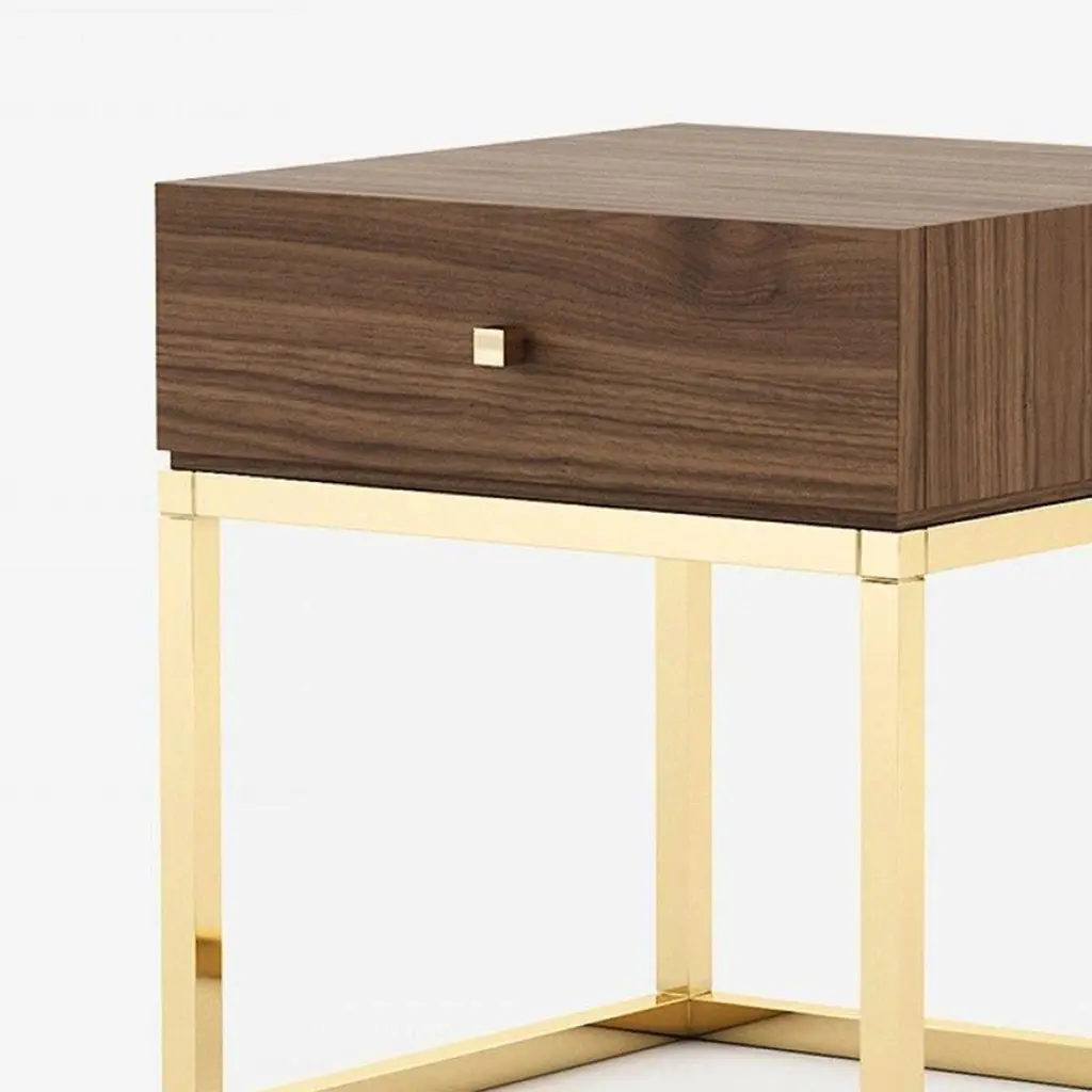 Side Table Tanka Walnut with wooden structure in matte walnut wood veneer,with 1 drawer with easy glide system. With polished stainless steel base and drawer's handle in gold finish.Also available in natural oak veneer, or in grey oak matte veneer, orin ebony matte veneer, on request.