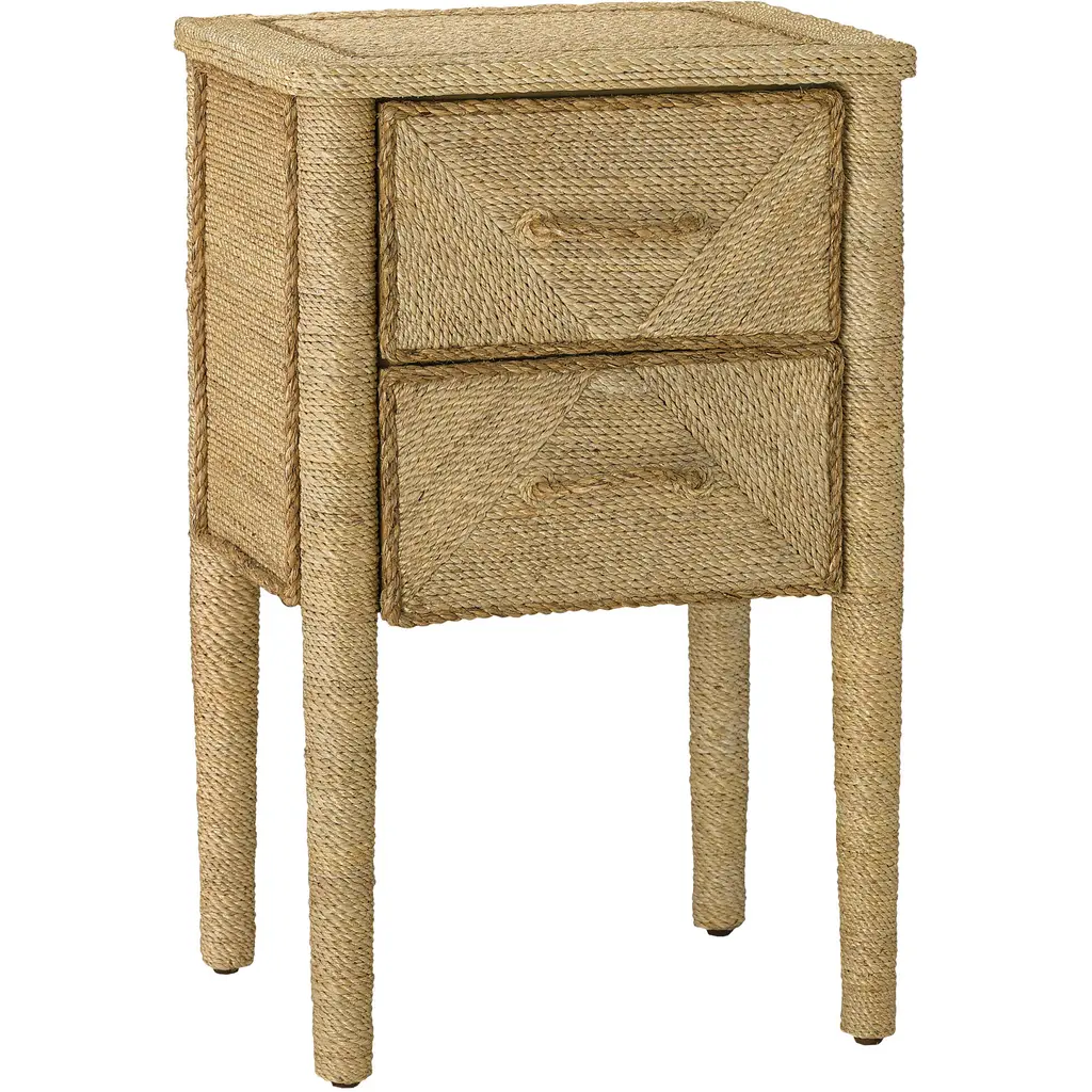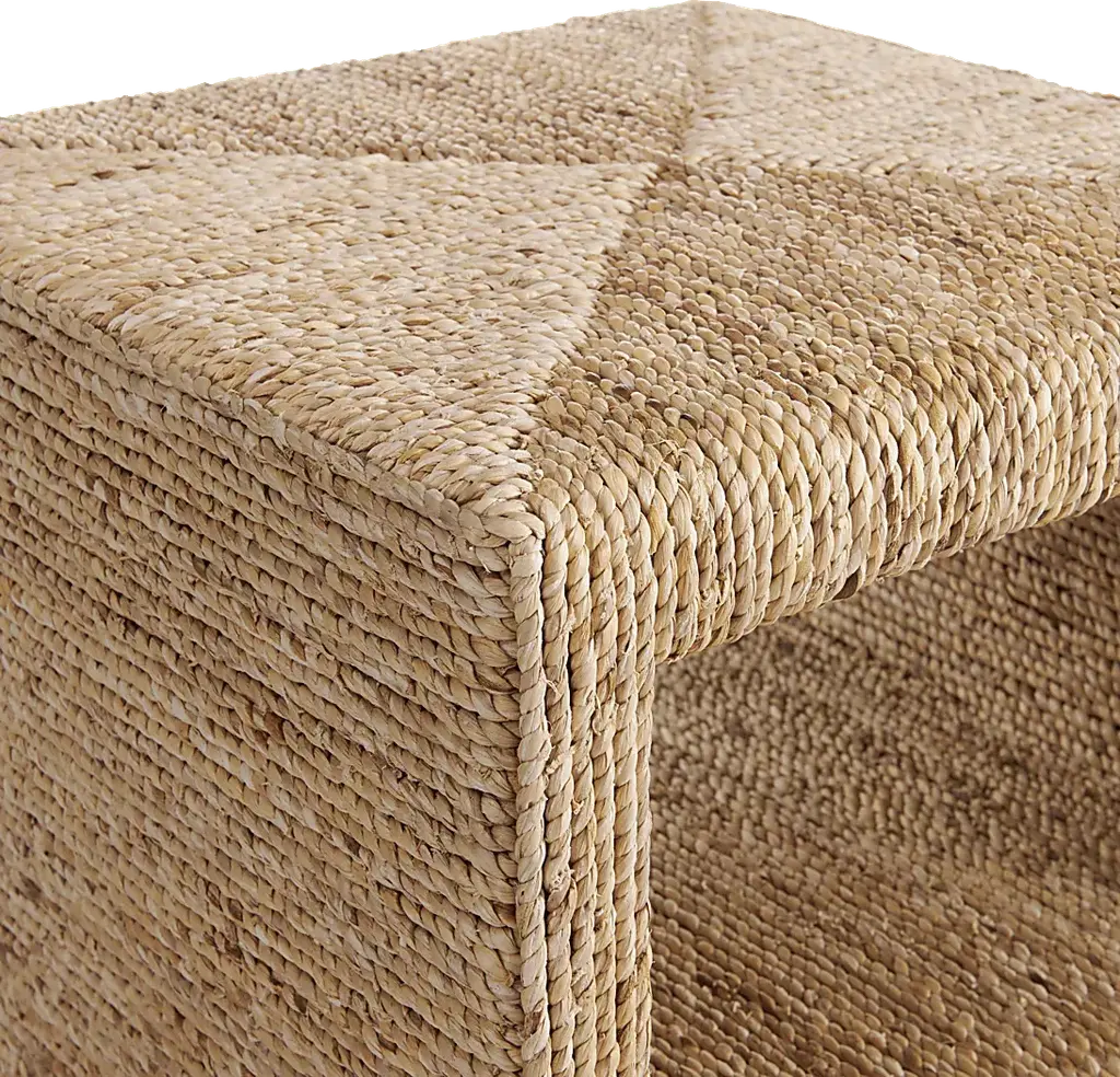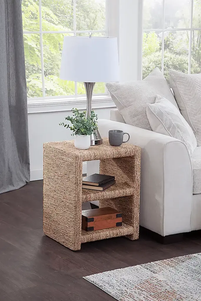 Experience a harmonious blend of craftsmanship, elegance, and tactile allure with this Tannaz end table. Artisan-crafted from seagrass cord meticulously woven around a sturdy wood frame, the table radiates a sunlit aesthetic, capturing the essence of laid-back living and casual style. The sustainable natural fiber envelops every contour, while an interior wood frame provides a striking contrast, ensuring a coastal vibe as well as dependable durability. Perfect for placement next to your couch topped with lamps and accents. With a slender design, this piece is also ideal for use as a hallway or entryway table, or use as a nightstand. Two 2 shelves offer practical and visually appealing storage solutions for magazines, remotes, or decorative items. Table dimensions 18 W x 18 D x 24 H Customer assembly is required.