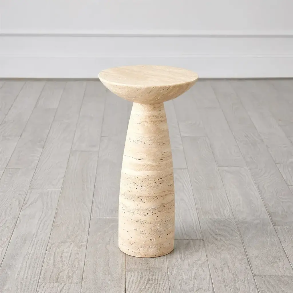 The Tapered Accent Table is a remarkable piece, made entirely from turned travertine stone. Its versatile design allows it to be placed in various spots around the room, offering both functionality and aesthetics. As travertine is a natural product, please be aware that there will always be variations in veining and color. This is to be expected and makes every travertine product uniquely your own. From a fashion forward perspective, Global Views offers accessories, furniture, statement lighting, and an assortment of rugs and mirrors to add beauty and joy to your home.