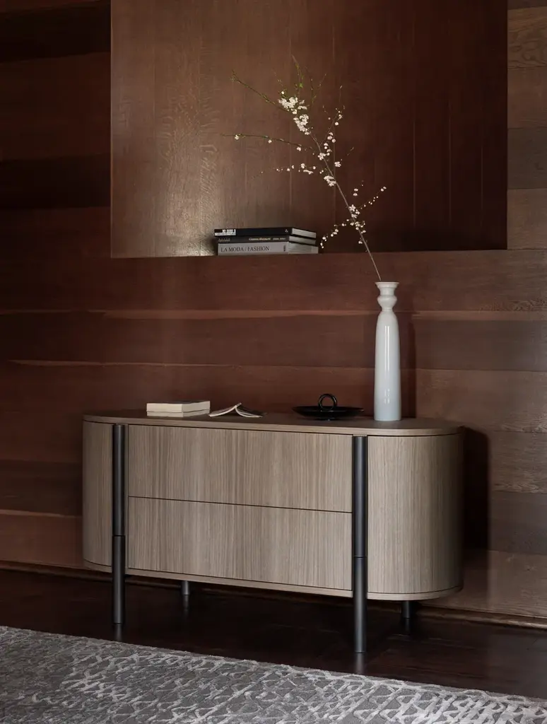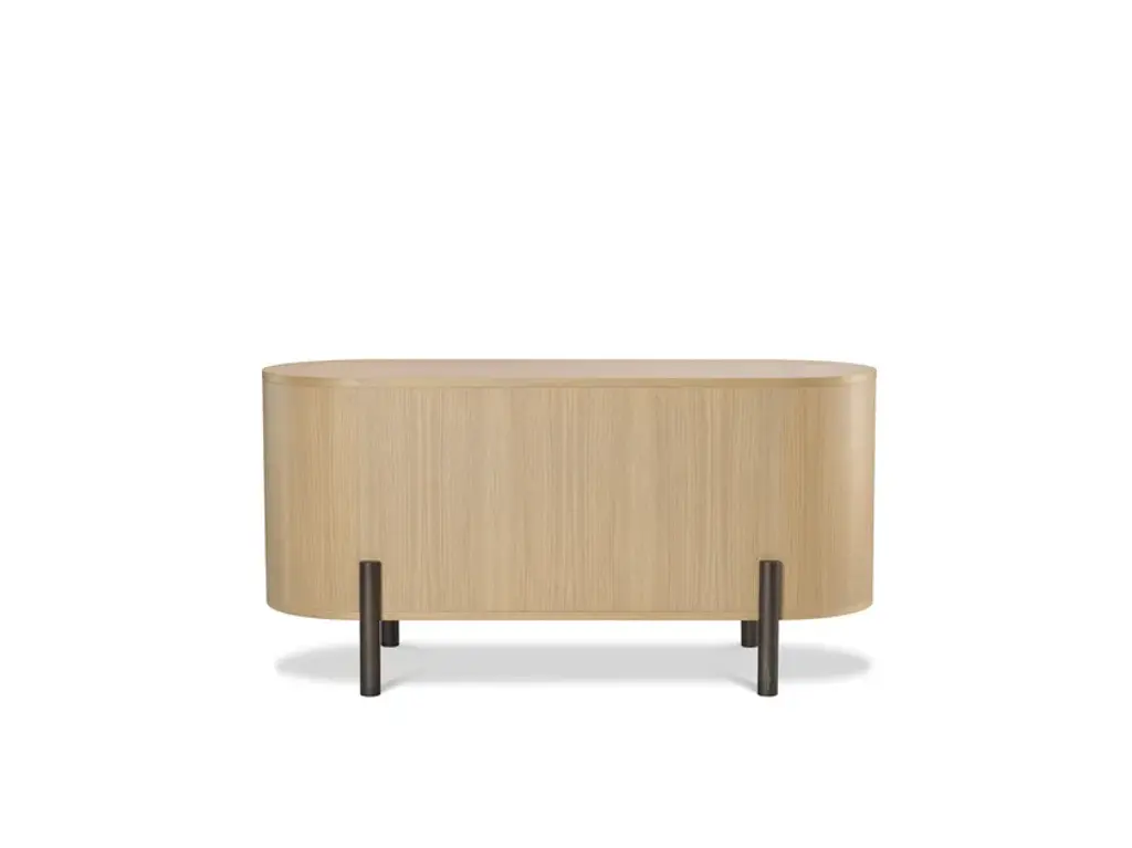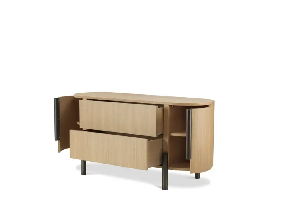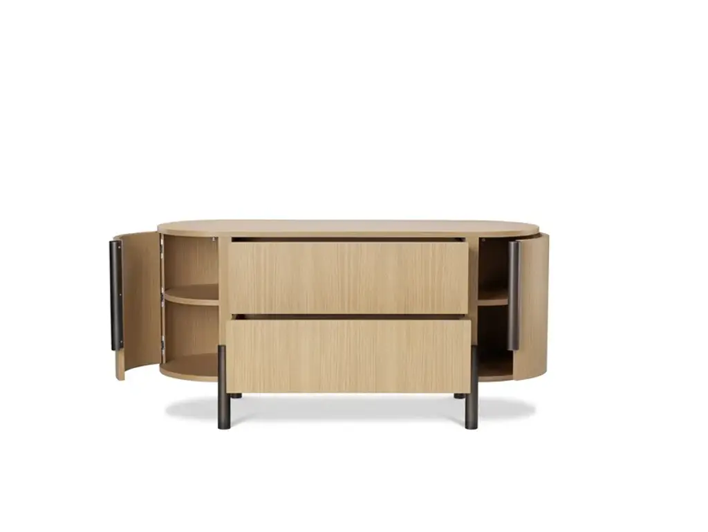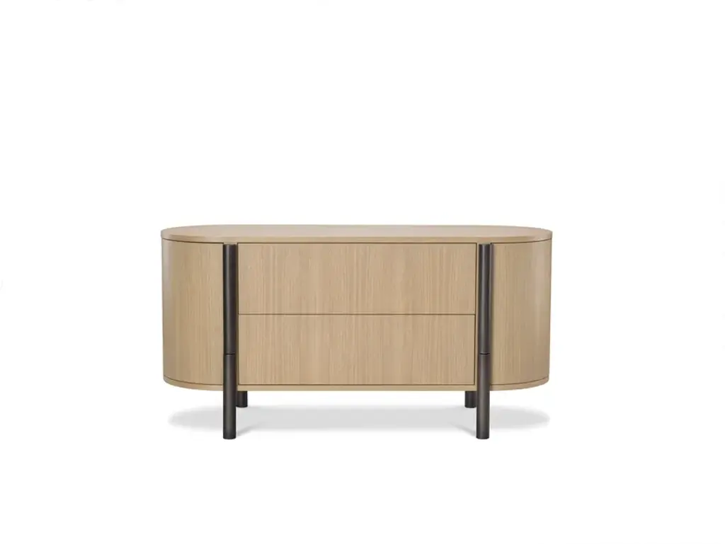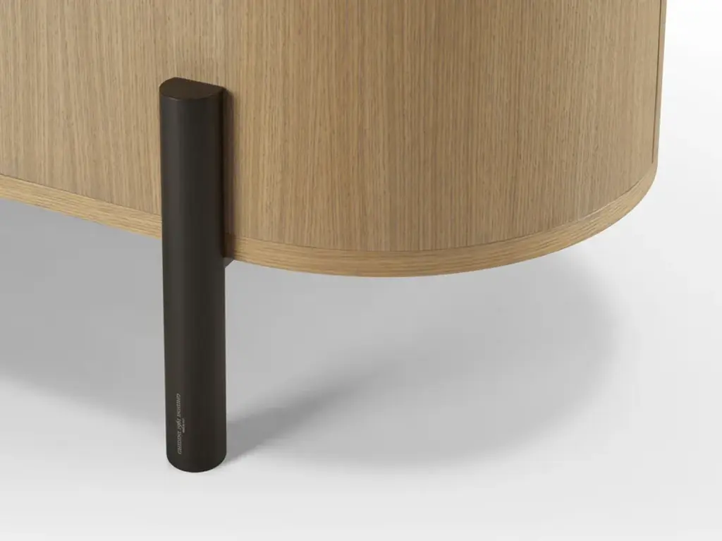 The Tarantino chest of drawers and bedside table feature curved and delicate lines that reference those of the bed, which they complement naturally.The Chest is a bed cabinet in oak with large front drawers and curved side doors. The cylindrical elements in aluminum perform the function of handles and supporting feet.