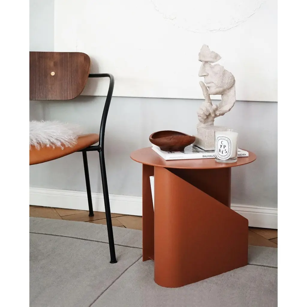 Taupe Sentrum side table by Schmahl +SchnipperingMaterials: MetalDimensions: D 40 x W 40 x H 36 cmAlso available in different colours. Please contact us.The founders, Mia and Torben Koed, decided to put their 30 years of experience into a new project. It was time for a change and a new challenge. The challenge was to build an ambitious design brand from the ground up with high-quality materials and great attention to the little details. With a drive to create new originals, the WOUD collection is founded upon the idea to look ahead instead of looking back and share the love for honest design. Therefore, we are eager to discover and develop new ideas whether it being in form, function or choice of material. Maximilian Schmahl and Fabian Schnippering are two talented German designers specialising in furniture, interior design and design concepts. The designers studied Product Design together at the Bauhaus University Weimar and found that they share a profound love for decisive details and soft shapes in their designs. In 2013, they established their own studio; Schmahl + Schnippering. With a belief that designs are a part of our culture, the studio creates objects that reflect the user’s needs. Their products are designed to integrate and interact with people as a natural part of their daily life. The functional approach to design and shared theoretical background is visible in the Sentrum side table. The design follows the principle of simplicity as it has been stripped from all unnecessary elements. What is left is a strong base and geometrical expression with the functionalities at the centre of attention. The S-shaped construction creates two spaces for storage on both sides to enhance the usability of the side table.