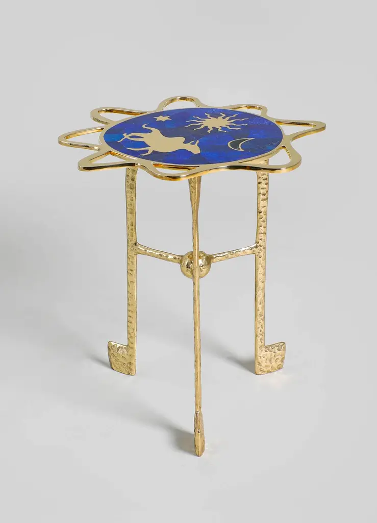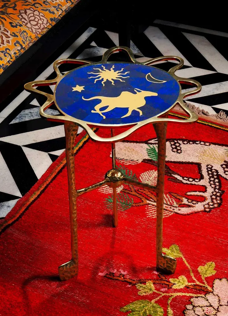 Bring the universe home, and see what’s written in the stars. These renderings of enamel and brass depict the ineffable mysticism of planetary movements, one which governs and dictates the lives of millions across India. Each meticulously designed object features a stone corresponding to its zodiac sign, reflecting the deep fascination held for the cosmic energies influencing destinies. These pieces serve as a tangible link to the celestial forces and elicit the true nature within us all.Side table in brass with semi precious inserts. Handmade in India.Product DetailsMaterial: BrassInlay: Lapiz Lazuli , Cat's EyeSize: 17.5"L x 16.5"W x 20"H 44.5 L x 41.9 W x 50.8 H cmWeight: 9.5 kg 20.9 lbsNumber of Pieces: 1 Side TableSKU: VST564This product has been handcrafted by local artisans. As such, slight variations are a testament to the unique character of a piece made by hand.