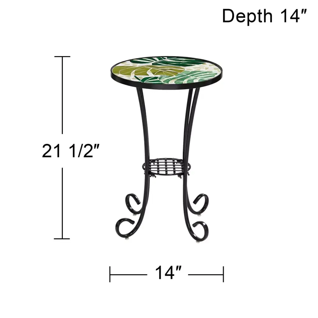Mosaic patterns show intricate details and incorporate artistic elements and design into this table. This contemporary outdoor accent table has a tropical leaf patterned mosaic top and a sleek black frame. This table also has a lower shelf to place a plant or any other type of decor accessory.