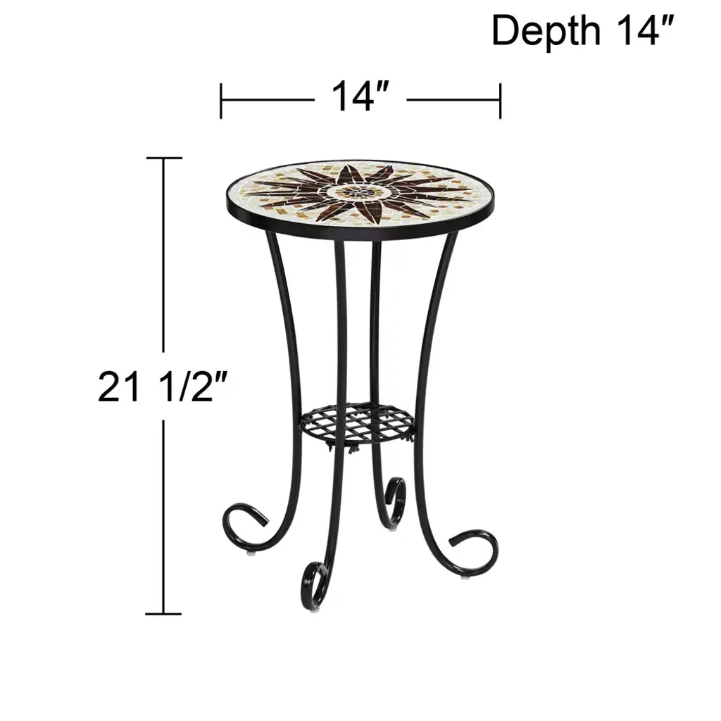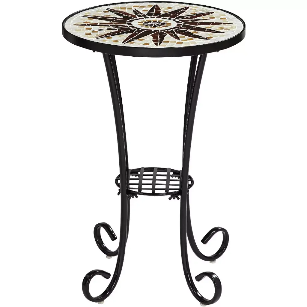 Mosaic patterns show intricate details and incorporate artistic elements and design into this table. This contemporary outdoor accent table has a sunburst patterned mosaic top and a sleek black frame. This table also has a lower shelf to place a plant or any other type of decor accessory.