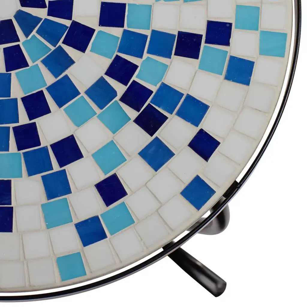 This round outdoor accent table features a sophisticated inlaid tile mosaic top made from aqua blue and green pieces. The frame and curvaceous legs are constructed of black finish iron that will withstand the elements. From the Teal Island Designs brand, this table is a great way to add fresh style and function to a porch or deck.