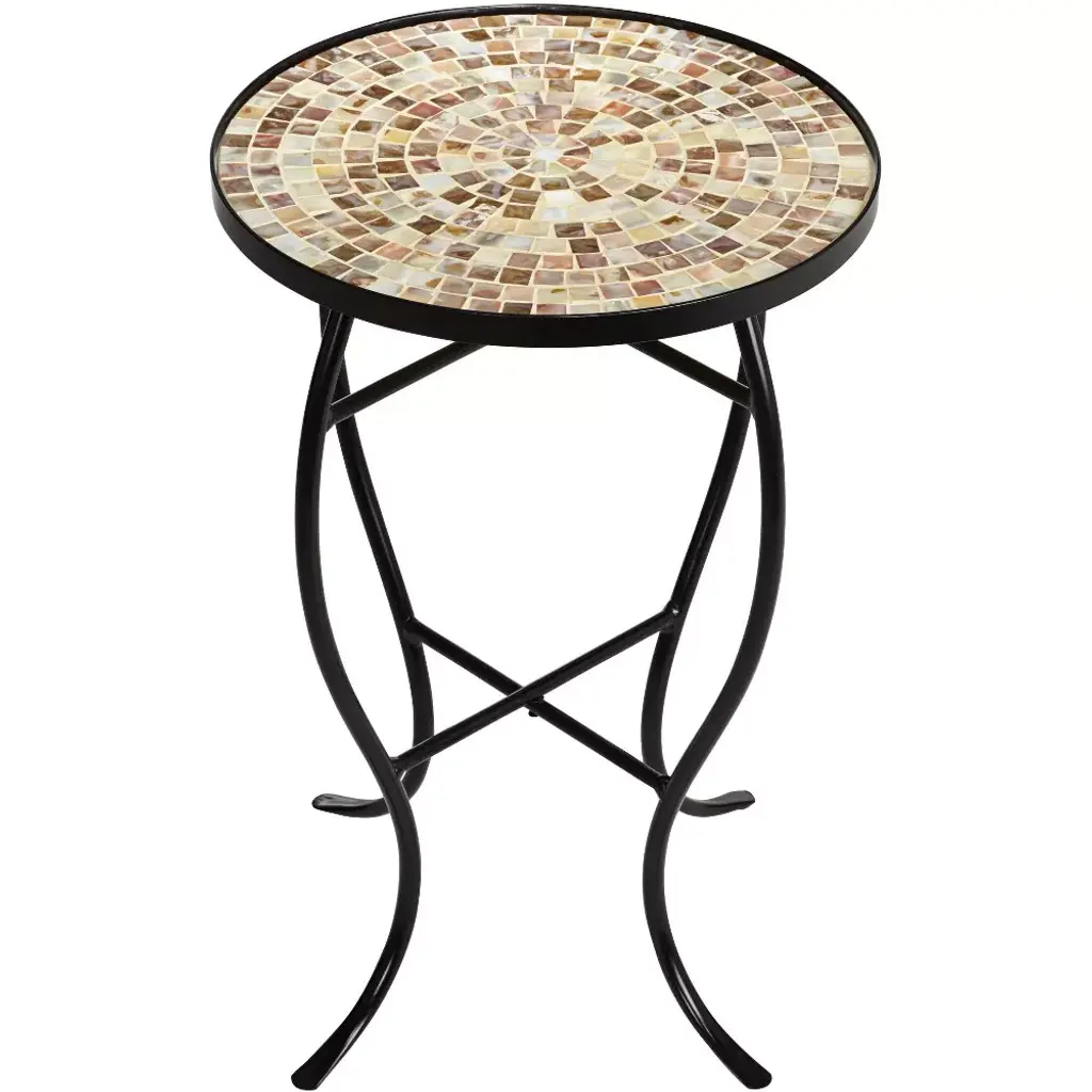This round outdoor accent table features a sophisticated inlaid tile mosaic top made from real mother of pearl. The frame and curvaceous legs are constructed of black finish iron that will withstand the elements. From the Teal Island Designs brand, this table is a great way to add fresh style and function to a porch or deck.