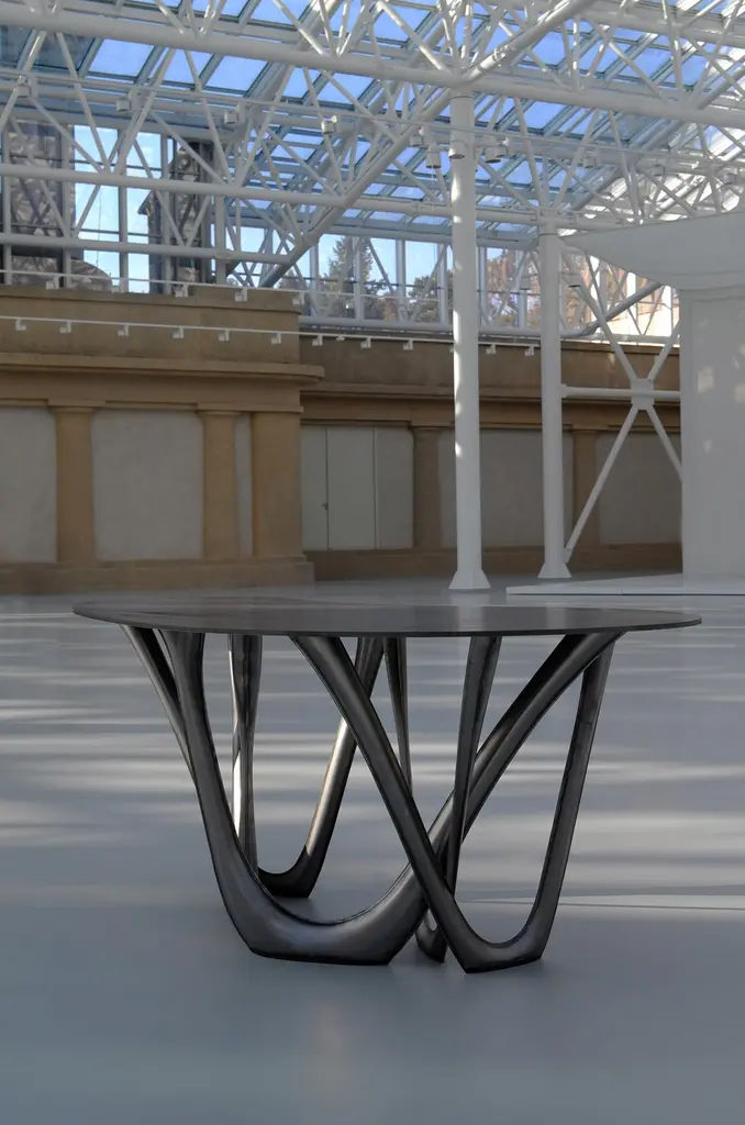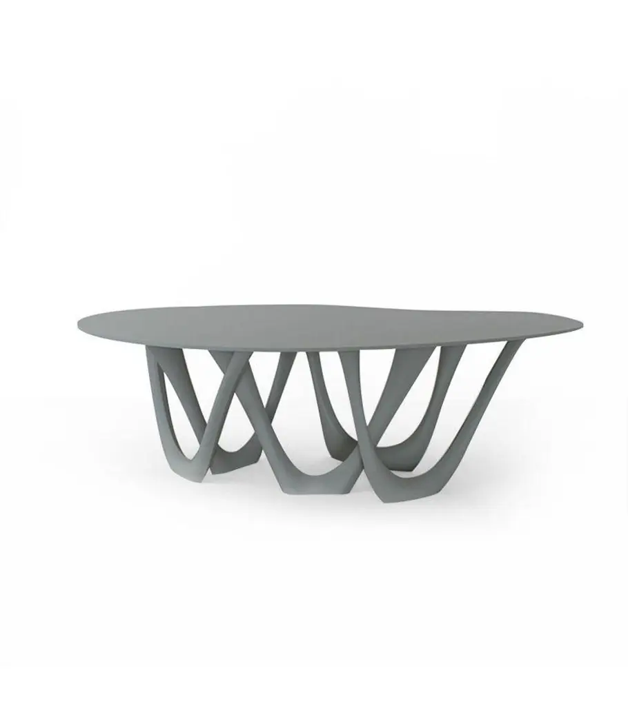Tele grey steel G-table by ZietaDimensions: D 110 x W 220 x H 75 cm Material: Carbon steel. Finish: Powder-Coated.Available in colors: Beige, Black/Brown, Black glossy, Blue-grey, Concrete grey, Graphite, Gray Beige, Gray-Blue, Moss Grey, Olive Green, Pale green, Resende, Stone gray, Tele gray, Umbra Grey, White Glossy, White Matt, Window grey or Yellow Olive. Available in finishes: Concrete, Stainless Steel, Wood top, and Aluminum. Also available in the side table version. G-Tables is a series of bionically shaped objects that are customized for customers' needs. Each table is “tailor-made” and created together with the user who can choose from a variety of materials, finishes and also decide about parameters like the number of people sitting at the table. The shape of the table, leg construction, and legs layout is optimized by the algorithm applied by designers to fit the distant space and meet the most demanding interiors.About Zieta: Zietas main goal is to deliver uniqueness and customization in design and construction while keeping the production, transport, and warehousing innovatively efficient.This is how they imagine the future world: Light, durable structures of customized applications produced on demand out of one-of-a-kind parts, yet efficiently.They use a computer-controlled production process. Customized pattern, customized form, customized function, one-of-a-kind product, and outstanding precision are what they deliver.You will find all of this philosophy reflected in the products. The research, they discover new possibilities, they play with forms and they deliver a beautiful, innovative, surprising outcome to people who love the design and who care about design development.They believe their work is a valuable contribution to the world of design not only by the unique beauty of the forms but most of all by opening ultra-innovative opportunities of forming and new paths for the world of the future.