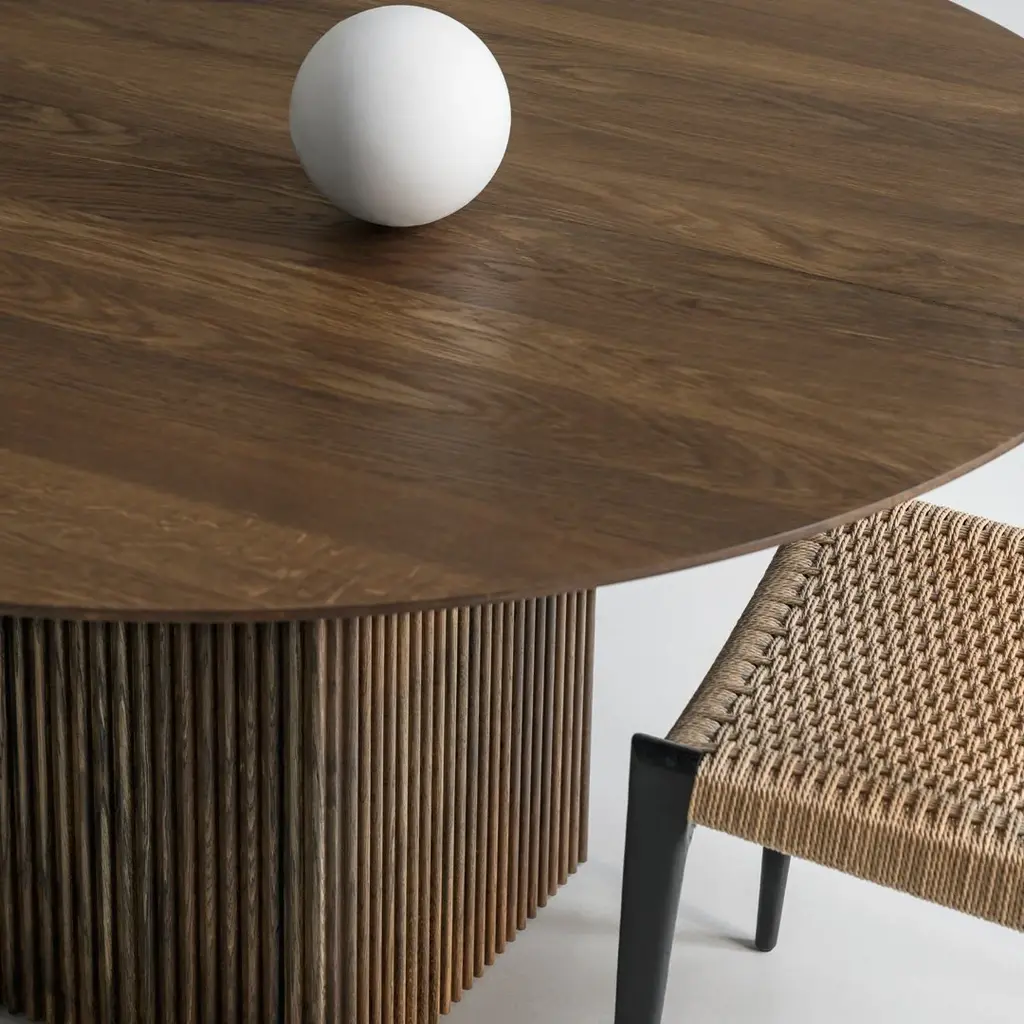 Each table is extendable for up to 2 extension leaves. Leaves are sold as singles, you must add quantity 2 if you would like 2. dk3 was among the first brands to introduce the plank table to the Scandinavian market back in 2009, and with the aim to take this design heritage to the next level, dk3 founder Jacob Plejdrup has developed the anniversary table TEN TABLE in cooperation with Danish designer Christian Troels. The designs of Christian Troels are characterized by a great level of details and craftsmanship accuracy, which, in the TEN TABLE, is perfectly merged with Jacob Plejdrup's basic ideas on large dining tables, such as highlighting the natural beauty of wood in a minimalistic way. The Table Top and table legs are made of solid wood, but despite the table's heaviness in size and weight, it still has a lightness, which is emphasized by the refined crafted details like the beautiful vertical grooves of the legs and the distinctive, organic-shaped Table Top. The slightly curved shape of the Table Top does not have any straight lines at all, and in combination with the sloping table edge, it looks like the Table Top is constantly moving. The curving movement continues on the extension leaves, which completes the overall impression and gives the table a unique expression.