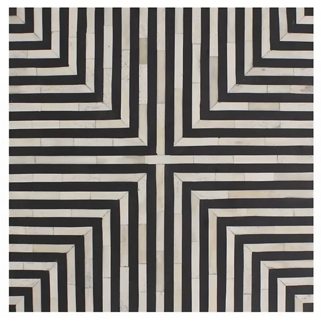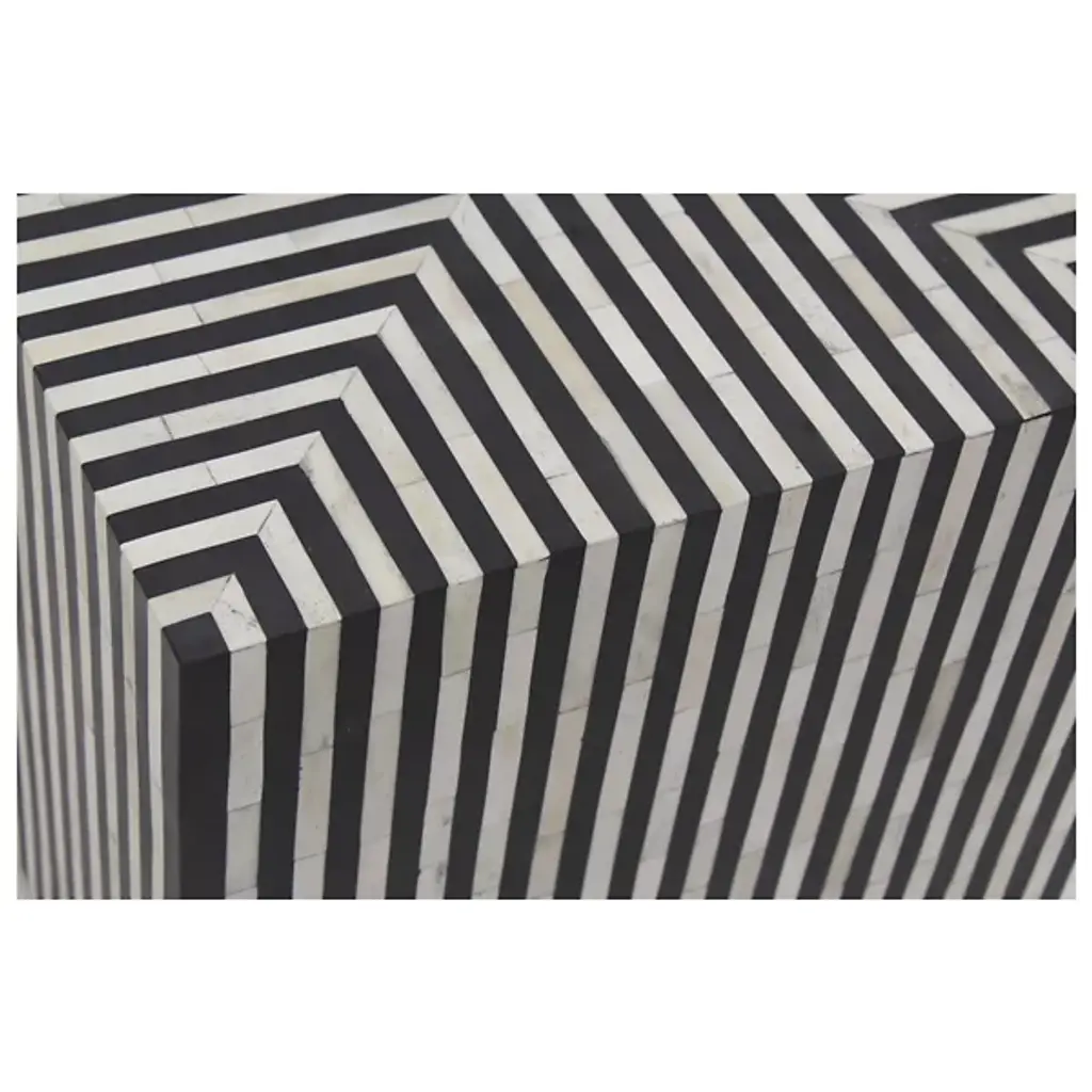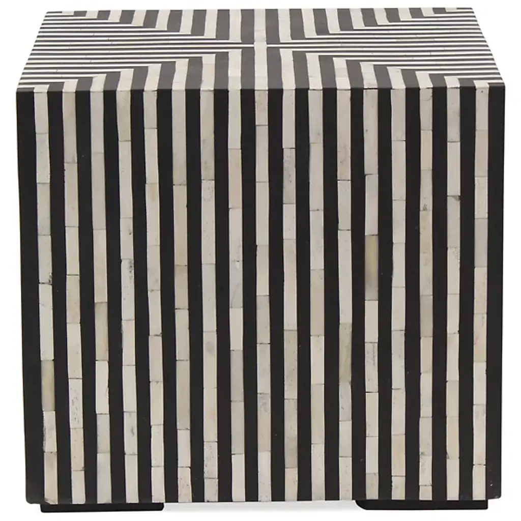 Present a stately appeal to indoor spaces with the captivating Deco lines of the Terning Side Table from Moe's Home Collection. A cubic sculptural structure set atop four subdued and inset feet, it’s fashioned from a mix of MDF and resin that suggests a bone veneer, though an animal-friendly one. Made in India, the interspersing of black lines with white, jointed accents draws the eye, while the top is divided into triangular quarters that draw attention to its contents.