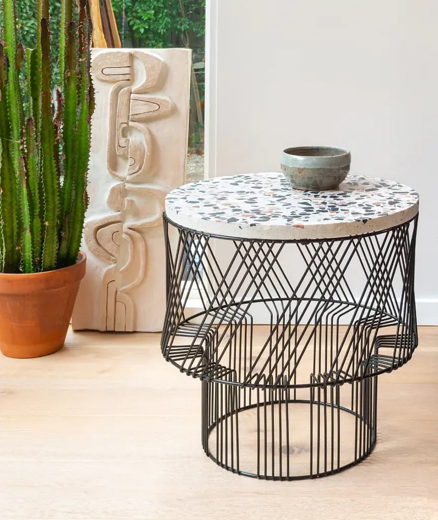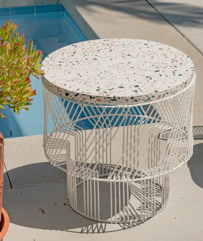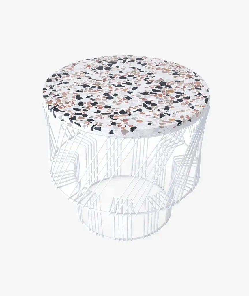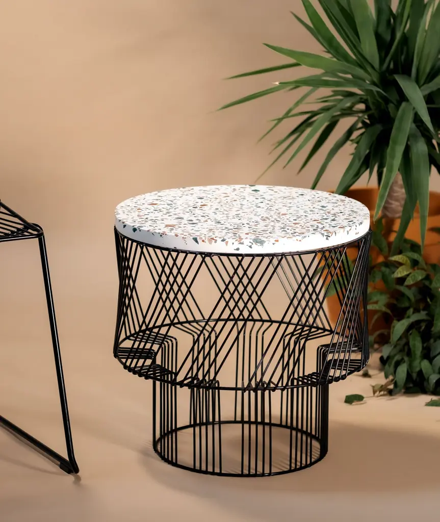 A modern wire side table with bold geometry and a concrete Terrazzo top, The Terrazzo Table is a colorful and fun addition to any garden, interior, or commercial space.
