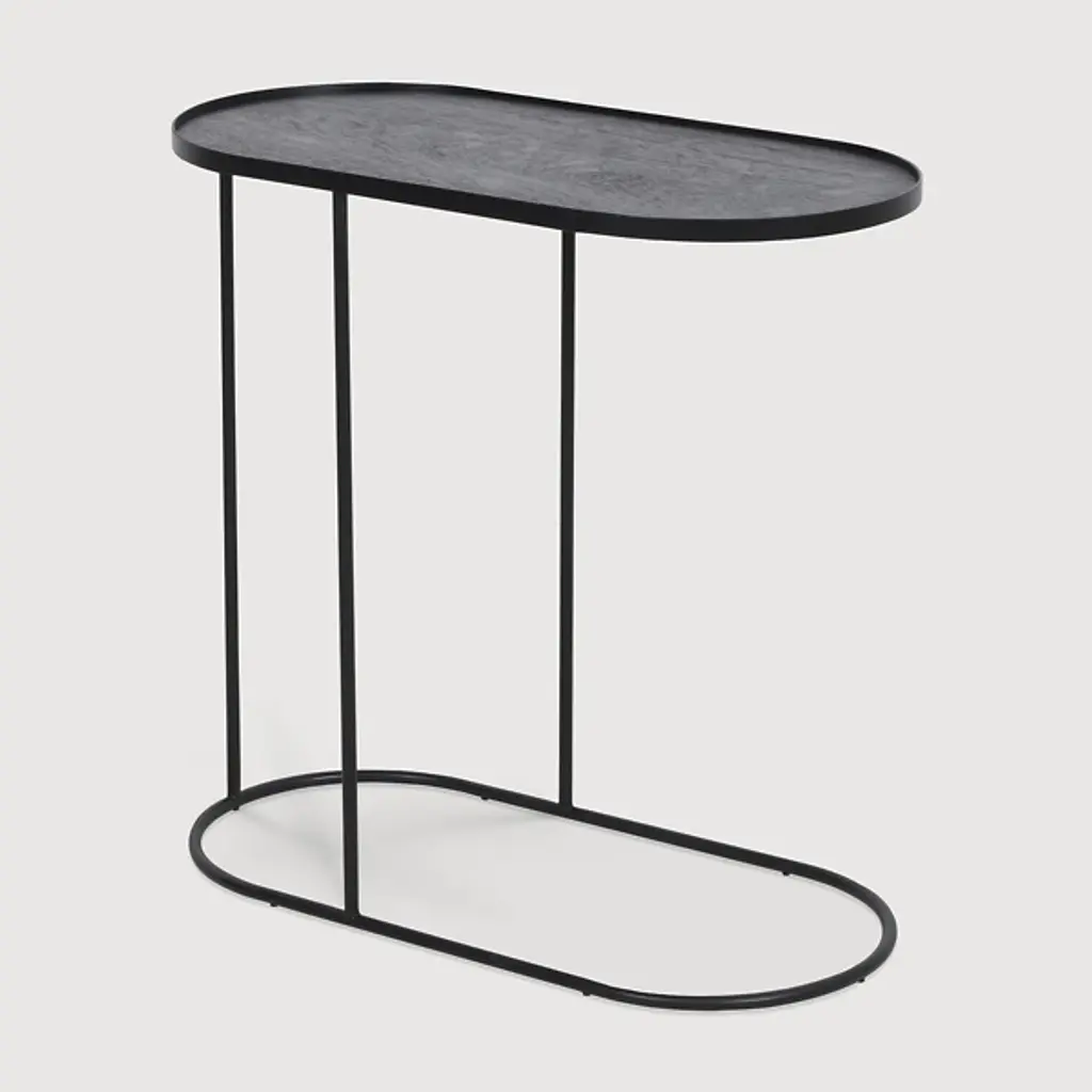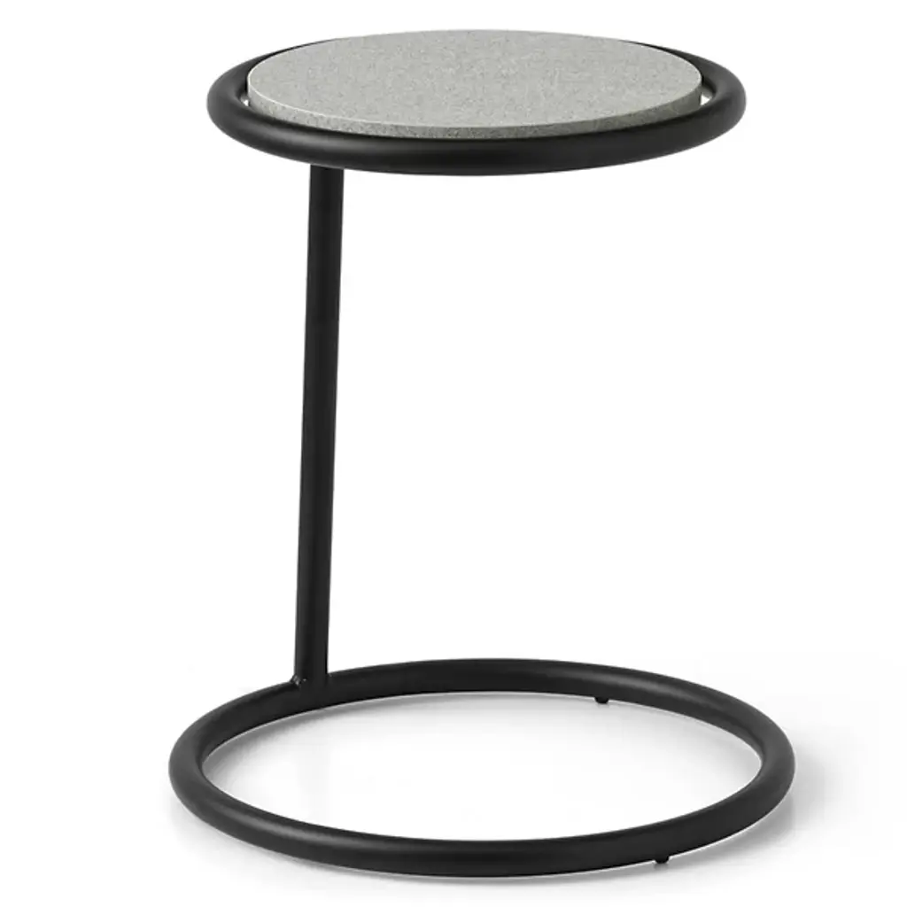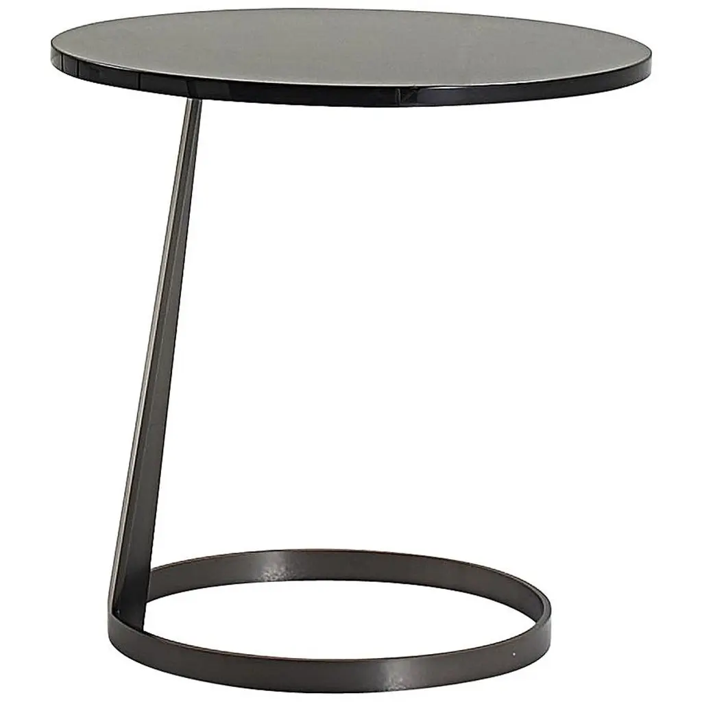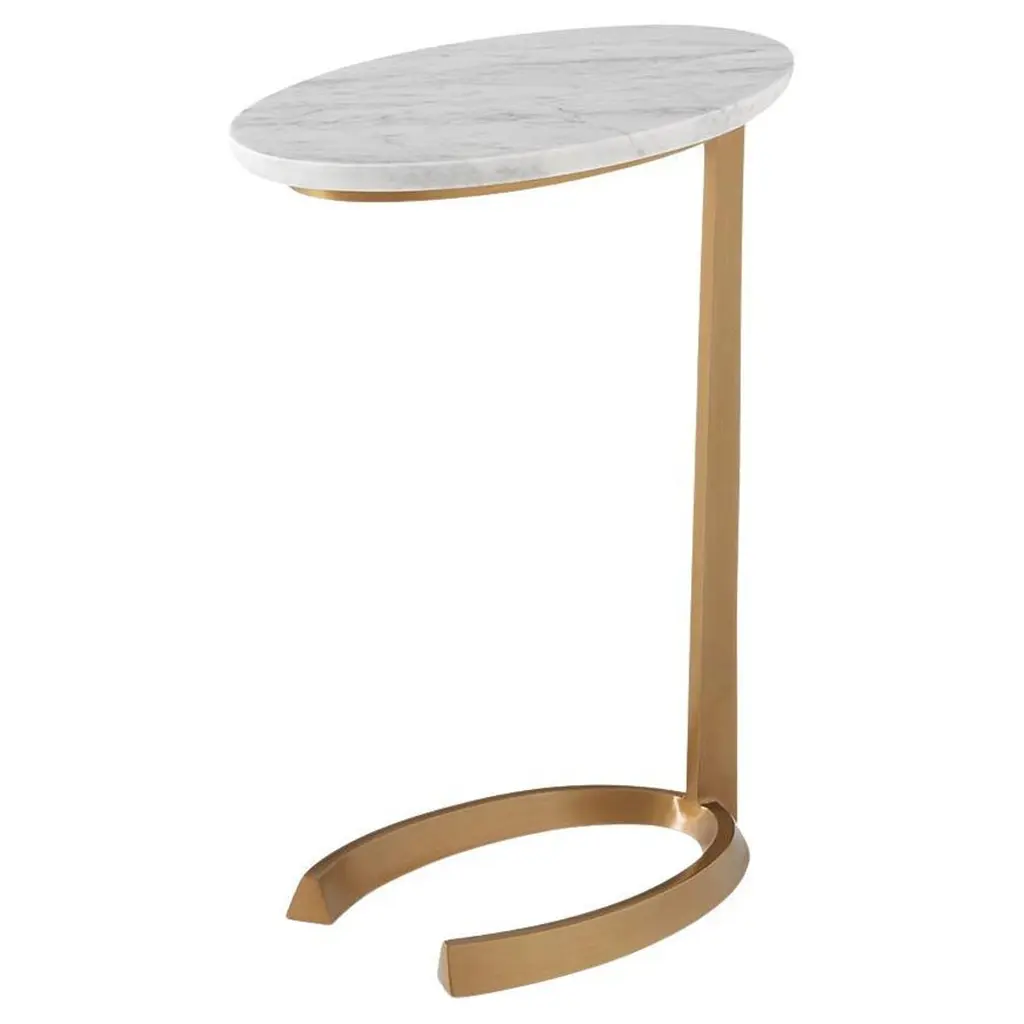 The effortless elegance of blunt profiles is celebrated in this enchanting, handcrafted accent table belonging to a series inspired by Thetis, the most beautiful of nymphs and goddess of the metamorphoses and sea. Distinguished by a delicate interplay of solids and voids, the design comprises a lightweight metal frame developing from a demi-lune base and supporting the circular ceramic top (stain-resistant) with a stunning Majestic marble-like effect.
