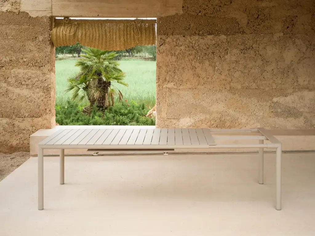 The design of the eco-friendly Tevere outdoor extensible table features smooth lines, centred on the absence of sharp edges and the rounded shapes of the legs.Tevere and TiberinaThe sustainable set (extensible table + chairs) for the sweet life outdoorsSlats, smooth rounded lines and eco-friendliness are the design cornerstones of the new elegant garden set by Nardi, consisting of the Tevere extensible table and the Tiberina chair: these two pieces of furniture perfectly match with their slats and circular legs.The aluminium frame of Tevere can be combined with the top and chairs in Terra-coloured regenerated plastic, or in Tortora, Antracite and Corda recyclable plastic. Ergonomically designed to ensure the utmost comfort, Tiberina comes with armrests (Tiberina Armchair) or without (Tiberina Bistrot), whereas Tevere is available in a choice of dimensions 147/211 or 211/275.This garden set embraces you with its sophisticated stylistic simplicity, meticulous attention to detail, attractive matt finish, and solid frames and shapes for flawless stability. Any open-air space can be furnished with Tevere and Tiberina thanks to their striking personality and functionality, and they are unaffected by weather conditions. In addition, the easy, intuitive table extension system enables the table to be extended while keeping the legs at the ends. The top has been designed for maximum resistance to wear and tear and is impact- and scratch-resistant.Technical details of the set:Tevere and Tiberina are the outcome of a special complex process. The strips on the top are joined to the underlying beams by vibration welding and no aluminium reinforcements are present: this reduction in materials leads to greater lightness and an additional focus on the environment. The lathe-turned legs are seamlessly welded to the top, perfectly integrating with the frame thanks to laser cutting. Tiberina reveals its dynamic design with its seamless stylistic fluidity.The sweet life outdoors with Tevere and Tiberina Slats, smooth rounded lines and eco-friendliness are the design cornerstones of the new elegant garden set by Nardi, consisting of the Tevere extensible table and the Tiberina chair: these two pieces of furniture perfectly match as they both have slats and circular legs.Materials: recycled plastic or virgin polypropylene, aluminium base for Tevere. Colours: Recycled plastic: Terra, with matt finish. Virgin polypropylene: Antracite, Tortora, Corda.