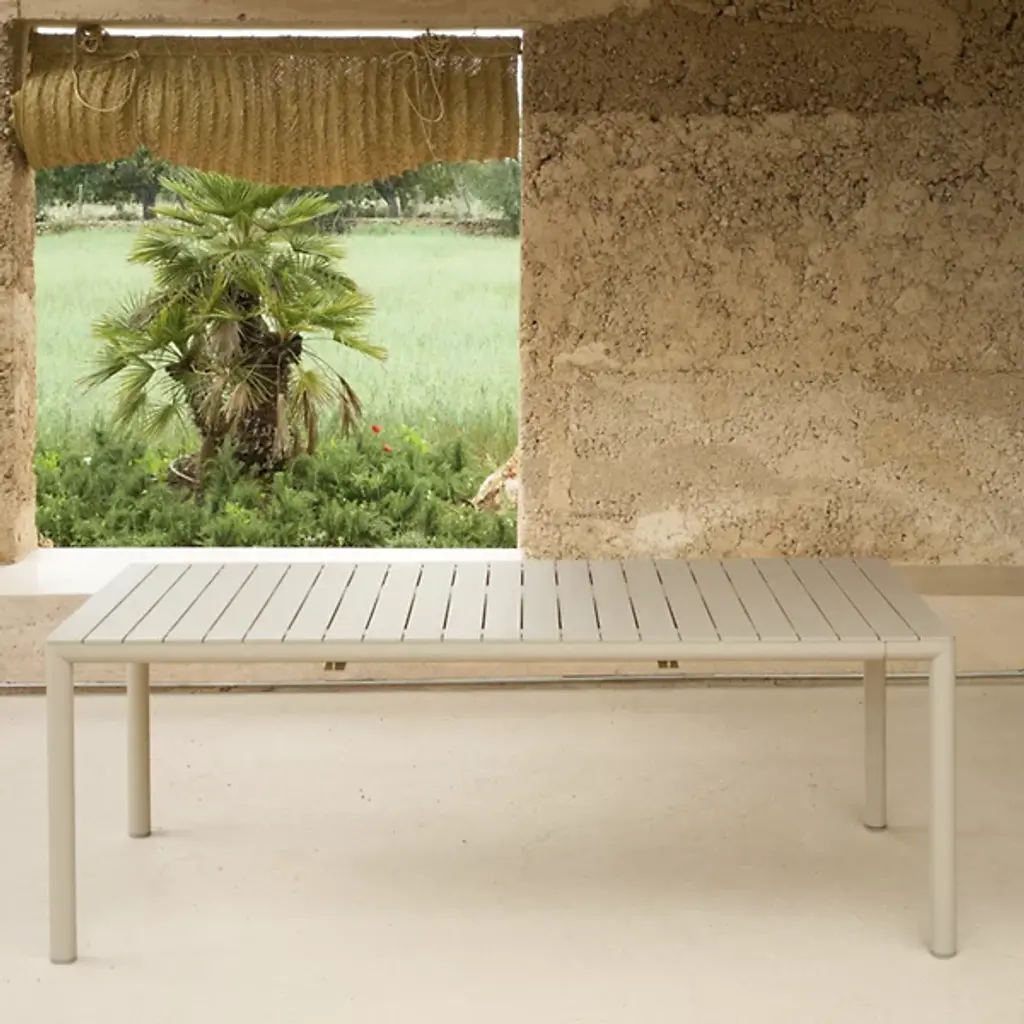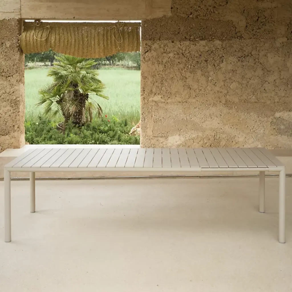 The Tevere 210 Extendable Table from Nardi Outdoor brings refined, sustainable design to outdoor dining. Created by Raffaello Galiotto and made in Italy, it features a matte-finished tabletop crafted from uniformly colored, UV-resistant fiberglass polypropylene resin. The frame is made of coated aluminum with four gently rounded legs, offering a smooth silhouette free of sharp edges. Its adjustable feet promise stability on uneven surfaces, while the use of recyclable materials showcases its eco-conscious approach, allowing for easy adjustment to differently sized gatherings.