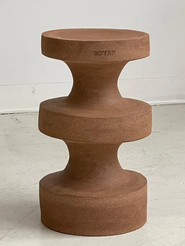 The Boyan side table by Zeynep BoyanDimensions: D 25.4 x H 43.18 cmMaterials: Terracotta stoneware clay.This item is handmade. Due to the nature of the medium and human touch, slight variations are expected. The Boyan side table I is an architectural and sculptural interpretation of everyday objects. It is a three level, two-sided table that is designed as a hollow piece minimizing its total weight. With an intention to increase longevity and achieve a natural finish, Zeynep used terracotta stoneware clay as medium. Each one-of-a-kind edition is carefully crafted and finished by hand in Montreal using coiling techniques. Zeynep Boyan is a self-taught artist and designer based in Montréal, working with clay as her primary material. The foundation of her creative practice is an exploration and reflection of her visual memory - a culmination of spaces, nature, expressions of self, and past influences. She explores the transmission between visual memory and medium by concentrating on natural materials and using classical techniques from a contemporary perspective. She is largely inspired by organic forms found in nature reflecting femininity, masculinity, fluidity and everything in between. Aspiring to work with a material that she can disrupt in volume, shape and body, clay allows her to engage in this process with its fluid & plastic characteristics. Seeking to create something close to earth and nature, she focuses on creating biomorphic plasticity of form in her work by using balance, tension, negative space and movement as the main elements. Each one-of-a-kind piece is built and textured by hand, encompassing pinch, coil and slab methods and is high-fired in stoneware clay.