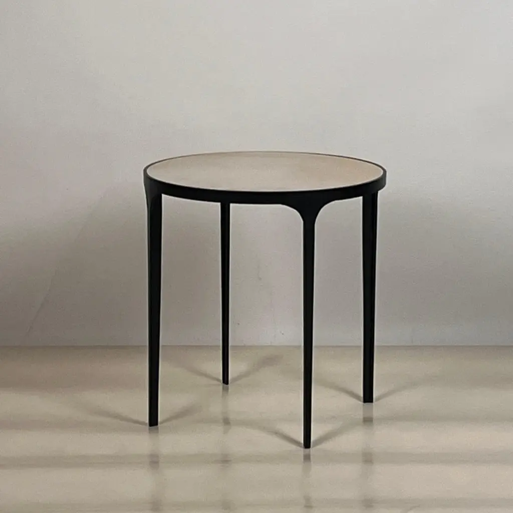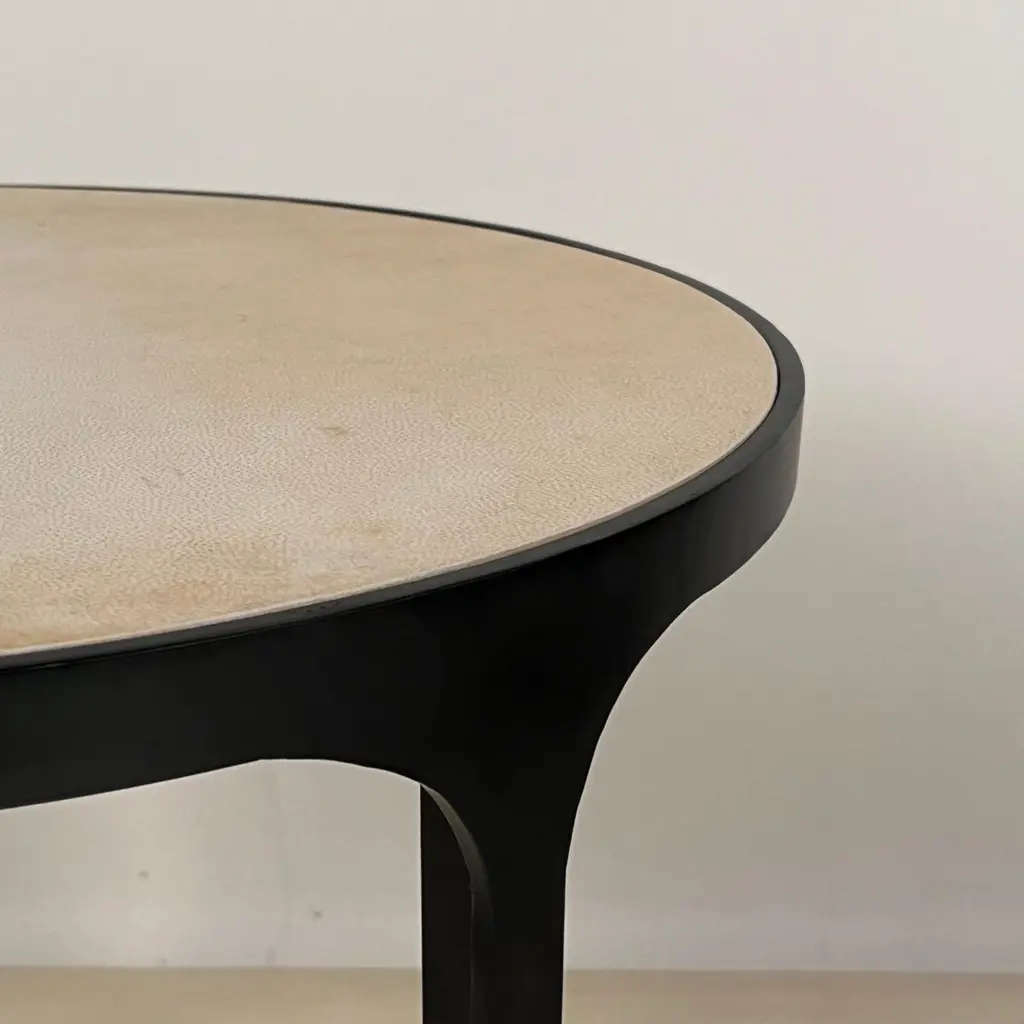 Round 'Esquisse'™ wrought iron and parchment side table by DESIGN FRÈRES®.Real parchment-clad top. Chic and understated.This Esquisse™ table is an exclusive DESIGN FRÈRES® design. Parchment is a natural material and surface patterns may vary.