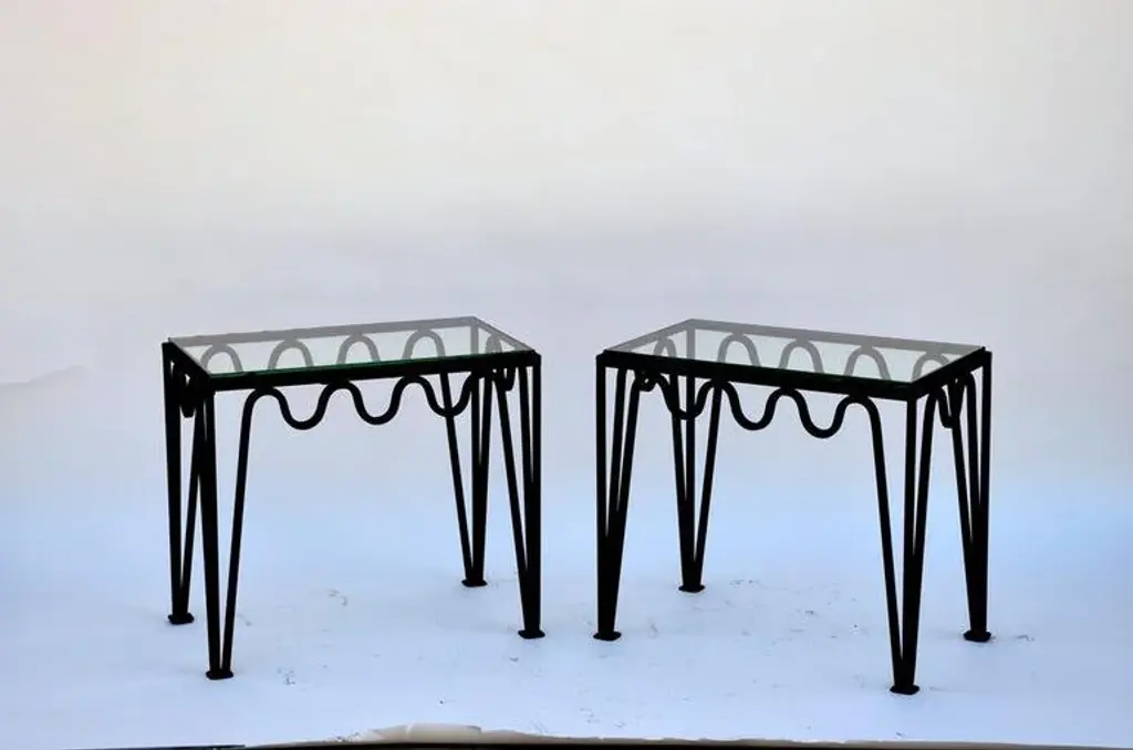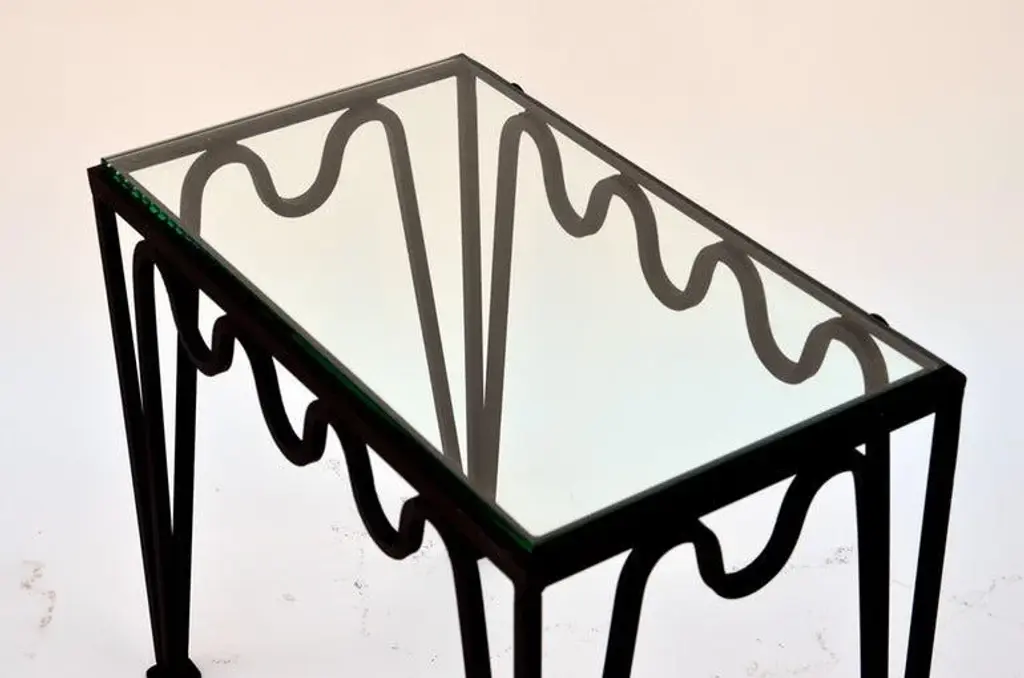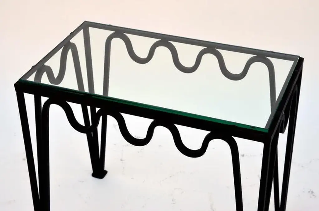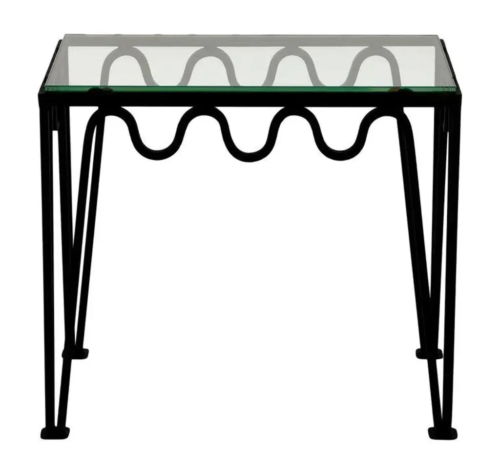 Undulating matte black iron and glass side table by Design Frères. Great as a pair of sofa end tables, a 2 part-coffee table, or as a stand alone side / occasional table. Available in verdigris.