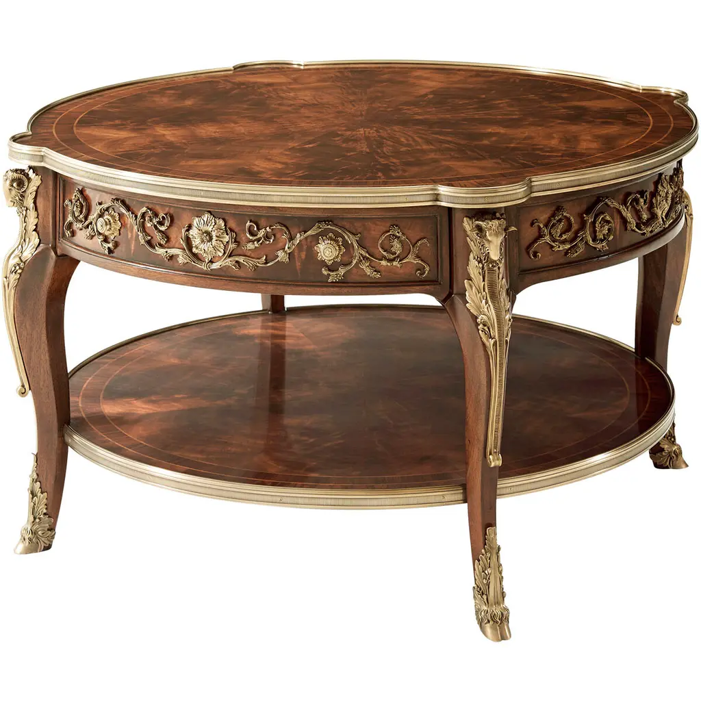 A fine mahogany and morado crossbanded lamp table, applied with very fine brass mounts, the brass bound circular top and undertier with protruding corners and a frieze drawer, on cabriole legs.