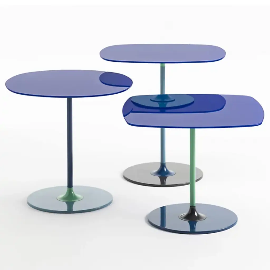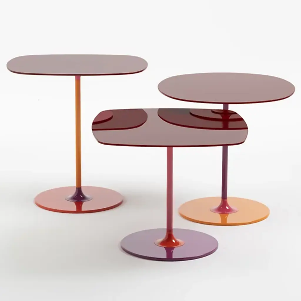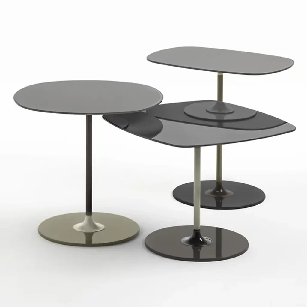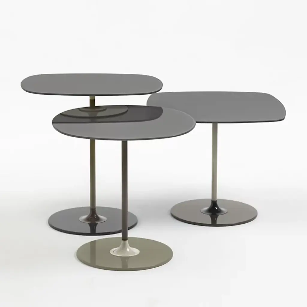 The Thierry Side Table Set of 3 from Kartell provides a smooth and artistic addition well-suited to contemporary spaces. A Piero Lissoni design from Italy, each table is steadied by a sleek steel disc base rising along a central stem and securing round-cornered steel tabletops at different heights, using sleek steel textures to suggest layered jewelry. The tables can be arrayed in a descending or ascending arrangement of layers, adding a more complex, cohesive appeal to their environment.