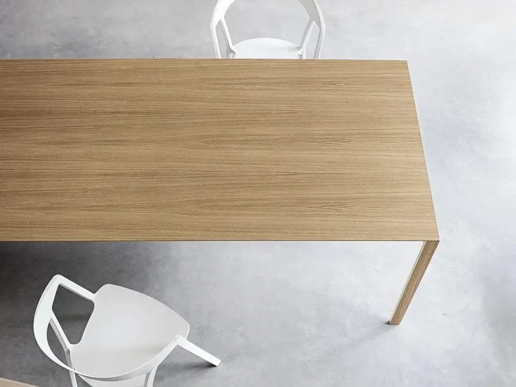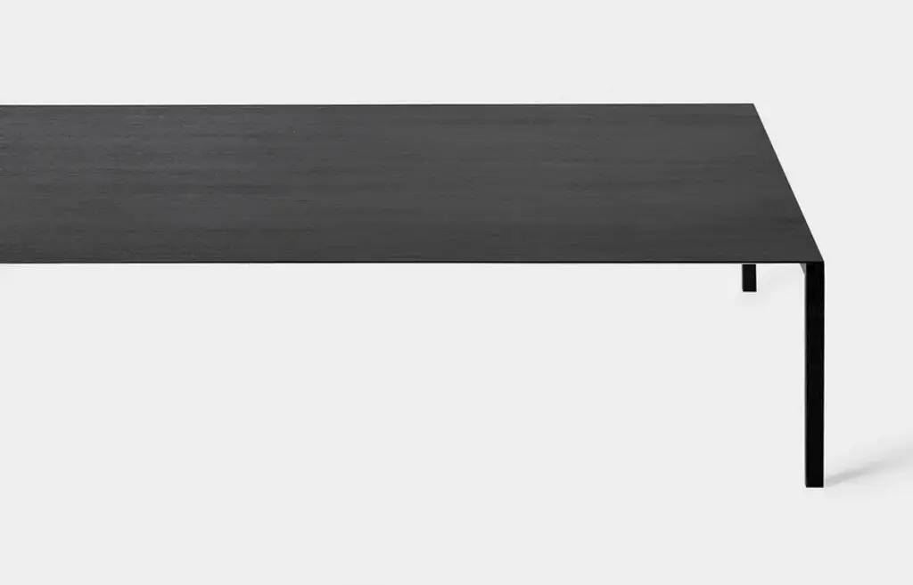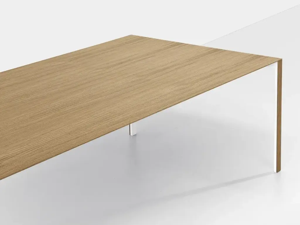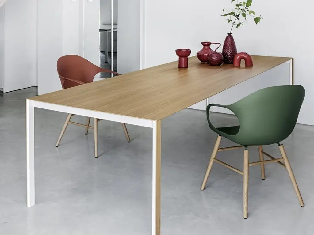 New input for one of the bestsellers by Kristalia, the Thin-K table designed by Luciano Bertoncini. Now, the aluminium tops are also available in genuine wood veneer with brush-effect, a technique that highlights the natural grain of wood. It is still a challenge for Kristalia and the designer to keep an extremely thin top: only 6 mm. Has there ever been such a slimline and resistant wood top? But the challenge does not end here. New dimensions have been developed for the table, up to almost 3 metres.