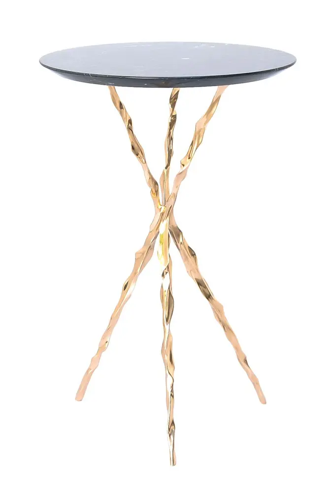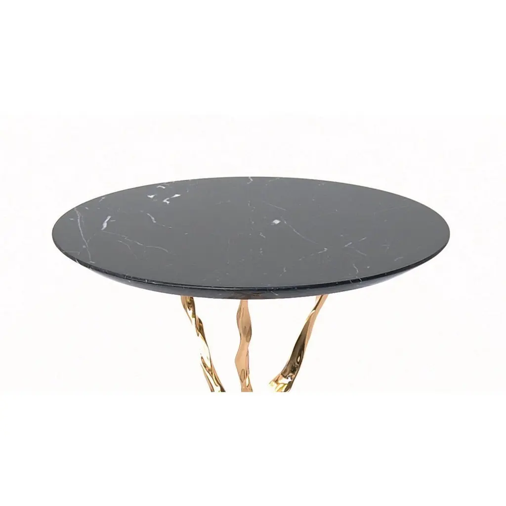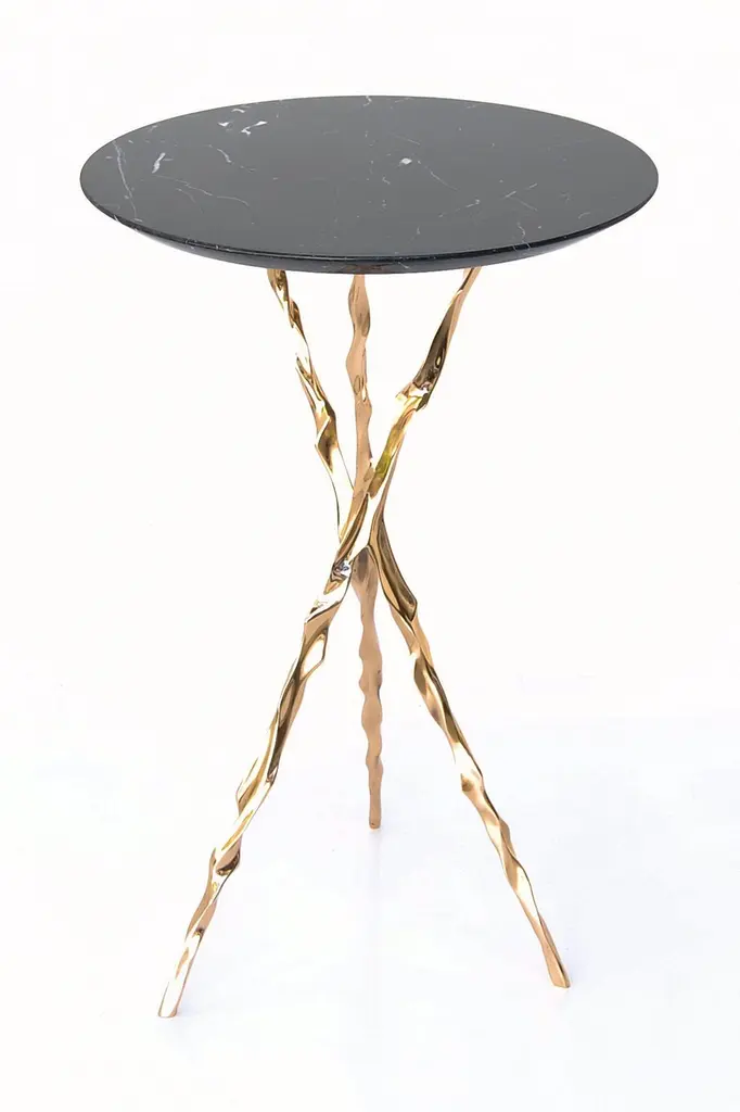 Thom drink table with Nero Marquina Marble top by Fakasaka DesignDimensions: W 40 cm, D 40 cm, H 62 cm.Materials: polished bronze base, Nero Marquina marble. Also available in different table top materials:Nero Marquina Marble Translucent OnyxBase: polished or dark bronze. FAKASAKA is a design company focused on production of high-end furniture, lighting, decorative objects, jewels, and accessories. Established in 2007, Fakasaka is the eponymous design company by Brazilian artist Fernando Akasaka distinguished by a penchant for producing intricate detailed cast bronze collectible design objects, furniture and jewelries. Fakasaka explores the contrast between the manmade and the natural through shapes and finishes that create a clear aesthetic. The constant challenge to balance elements is met with an outcome that is a striking assortment of bronze furniture and objects in oxidised and polished finishes, accented with precious regional stones, granites and rich prehistoric reptilian motifs.