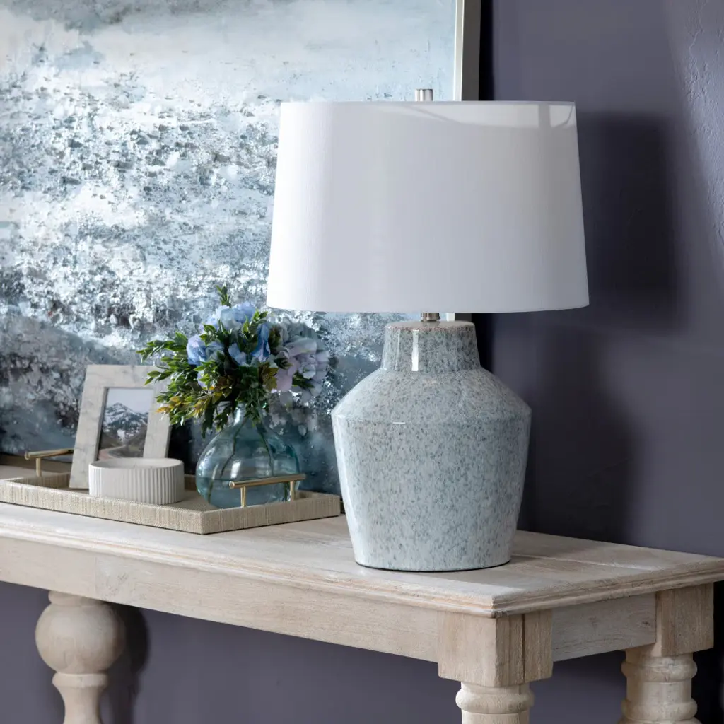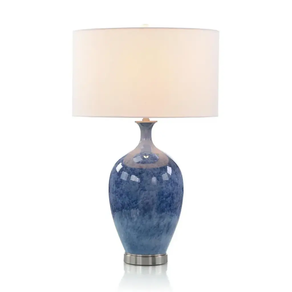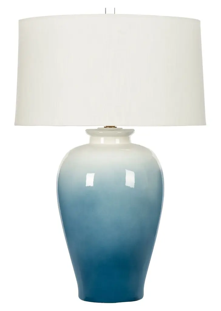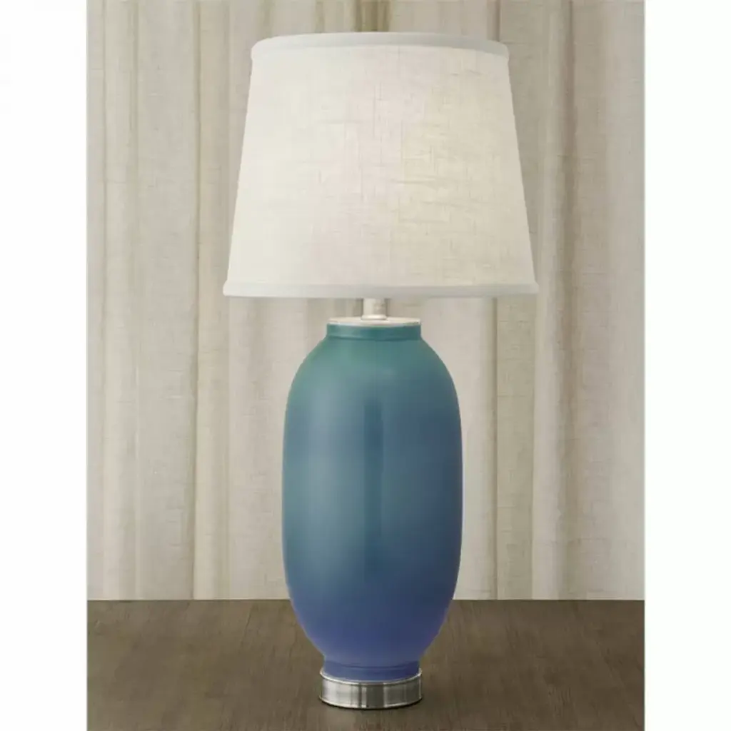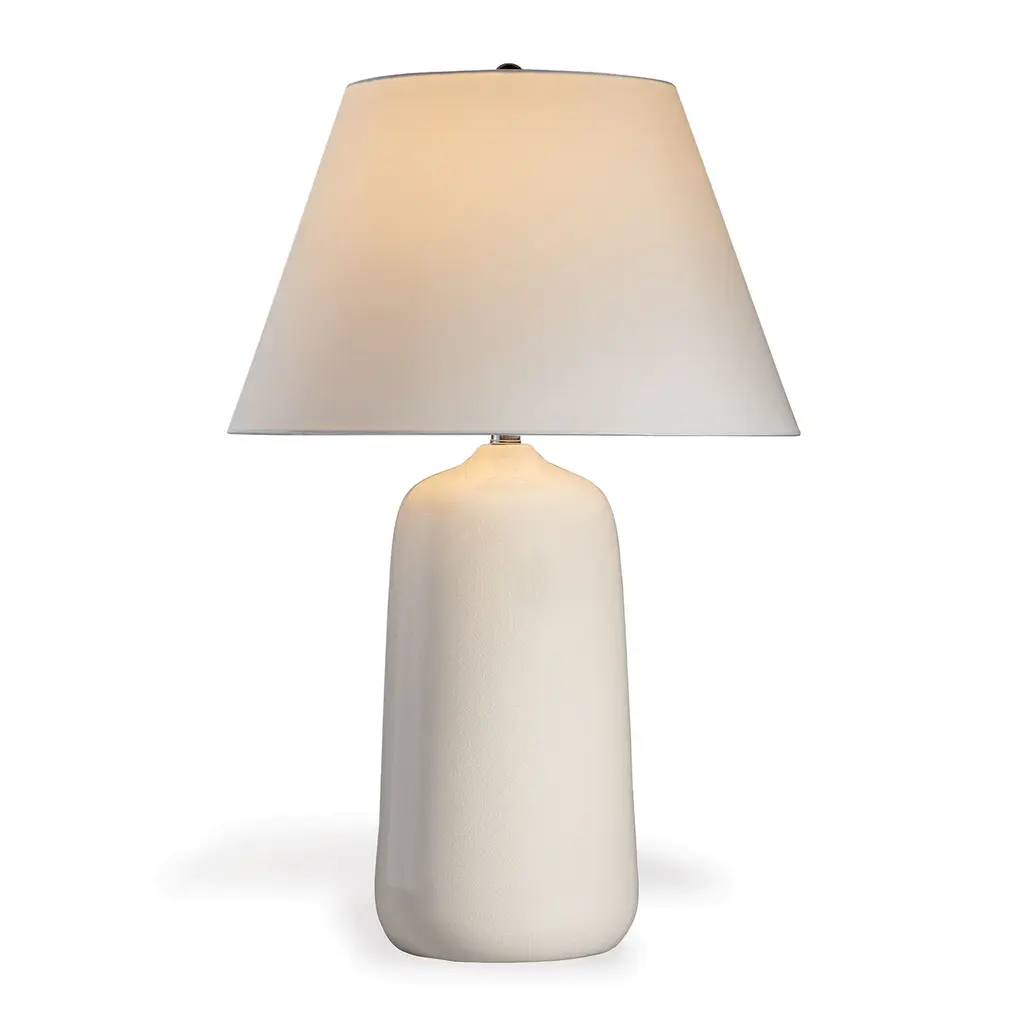Port 68's Thomas lamp is larger in scale and perfect on the end table next to the sofa, or on a bachelor chest in the bedroom. Available in cream crackle and celadon, Thomas features polished nickel hardware.