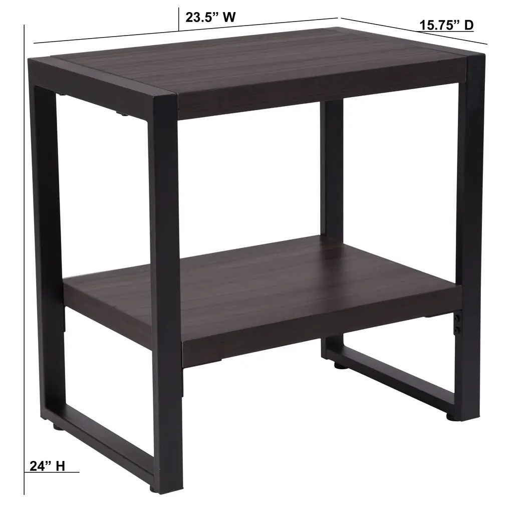 Add some sleek urban style to your space with this beautiful rectangular charcoal wood grain finish end table with metal legs. This table combines a durable, laminate top with straight legs and a wrapping frame to provide a contemporary look that's sure to tie any trendy room's presentation together. The surface area serves as a convenient space for holding belongings or displaying magazines, newspapers, and brochures. Meanwhile, its compact construction allows it to fit perfectly between sofas and loveseats, or in corners of rooms. Its charcoal design also lends a genuine wood grain appearance for an attractive, high-end look.