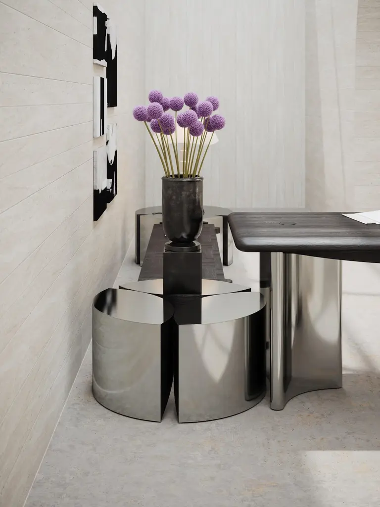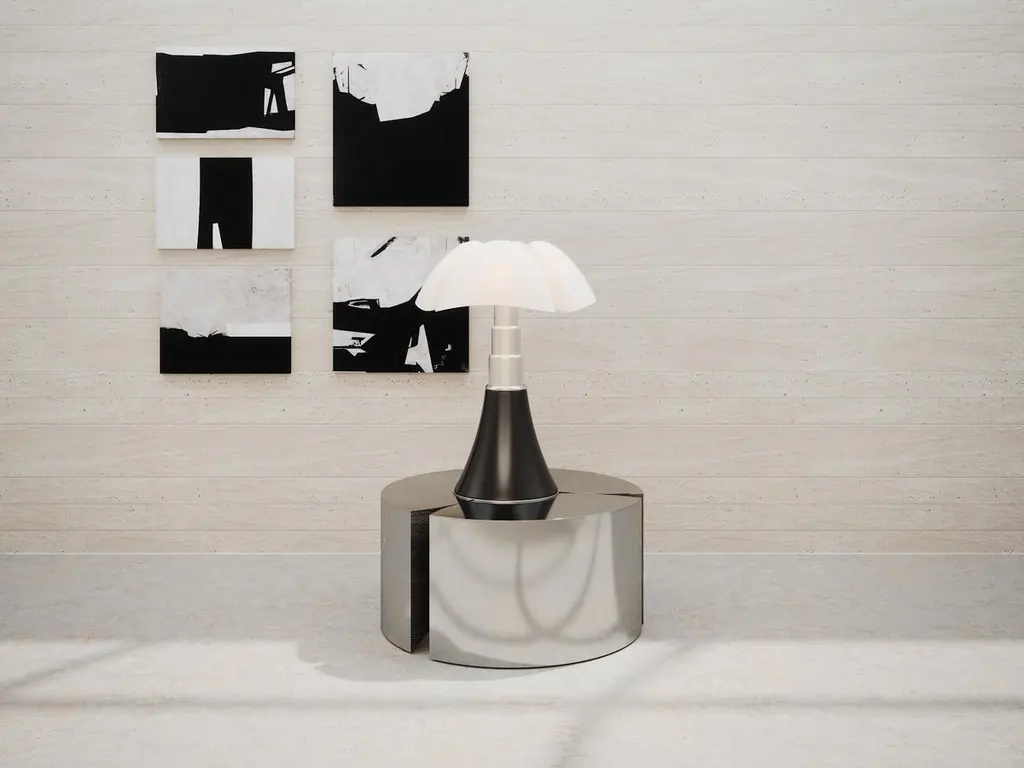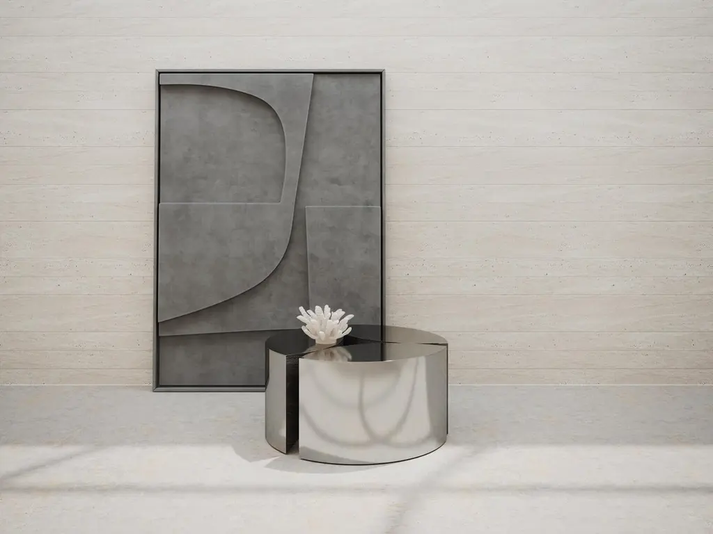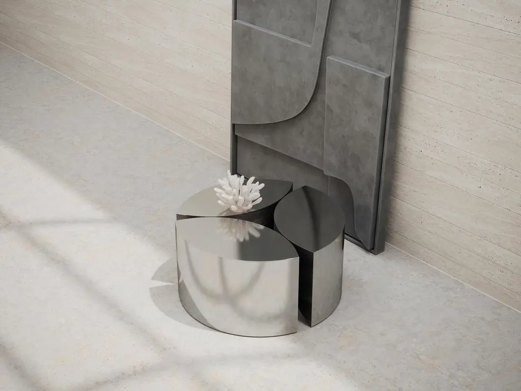Jeanjean Polished Steel and Black Oak Side Table by UltramobiliDimensions: D 80 x H 36 cmMaterials: Polished Steel, Black Oak.Low table consist of three elements, D 80 cm, external site ant top in metal, polished steel o bronze finish; internal side in Black Oak or Chestnut Burl.Ultramobili:Tactile materials and exclusive finishes, advanced functionality and uncompromising quality define the character and soul of each creation, the best business card with which ULTRAMOBILI furnishings present themselves to the world. ULTRAMOBILI collaborates with a group of highly selected craftsmen, closely connected to their home territory, Pesaro. It is from their manufacturing skills that all the brand's furnishings take shape, in a continuous exchange of skills that focuses on design ability and the intelligence of the hands. ULTRAMOBILI employs an international team of designers who every day imagine, design and create - with talent and passion, dedication and visionary spirit - all the brand's furniture: architectural sculptures that become iconic objects and furnishings for living. ULTRAMOBILI's credo is quality without compromise. An uncompromising vision that expresses itself every day in the choice of excellent materials and finishes, in the obsessive care for every single detail, in the constant search for advanced functionality and in the incessant striving for cutting-edge, unique and unmistakable design. ULTRAMOBILI also produces tailor-made projects, ad hoc creations capable of meeting the most intimate and profound needs of those who enter the brand's universe. Bespoke furnishings that are born in close connection with the architectural envelope that houses them, and that dialogue with the surrounding environment in the volumetric relationships of their components, in the materiality and colour nuances of the materials, in the chiaroscuro effects of the volumes and in the visual communicativeness that distinguishes them.