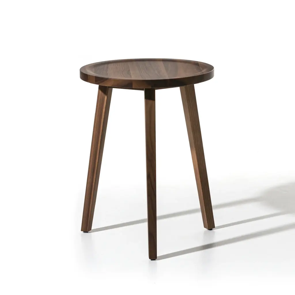 Elevate your living space with the Gervasoni Gray Three-legged Round Side Table, a stylish coffee table designed to enhance any room. Featuring a round top and clean, essential geometries, it combines simplicity with elegance. Available in different heights and finishes, including premium materials like Canaletto walnut and lacquered oak. The slightly raised top mimics a tray, adding a subtle yet sophisticated detail that enhances both form and function.
