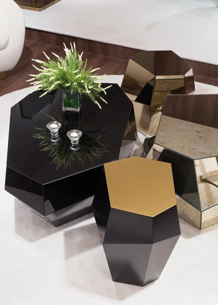 The original design of the Three Rocks tables was inspired by the Autumnal landscape with fallen leaves in burned tones. These tables are highly customized designs.Beyond the original version, all three sizes can be customized with a large range of materials and finishes. With incredible versatile designs, these tables can be seen in restaurants and luxury hotel projects all-over the world.Product detailsWood structure in black lacquered matte finish and top in brushed brass plate.Product optionsWood veneers, natural, aged or degrade gold/silver/copper leaf or any Ral Classic color finished in matte, half gloss or high gloss varnish. Lined with normal/bronze/aged mirror or white/black lacquered glass.Weight 8Kg 17.7 lbs Made to order. Other finishes are available under request.Designed by Joana Santos Barbosa for InsidherLand, 2013. Handmade in Portugal.