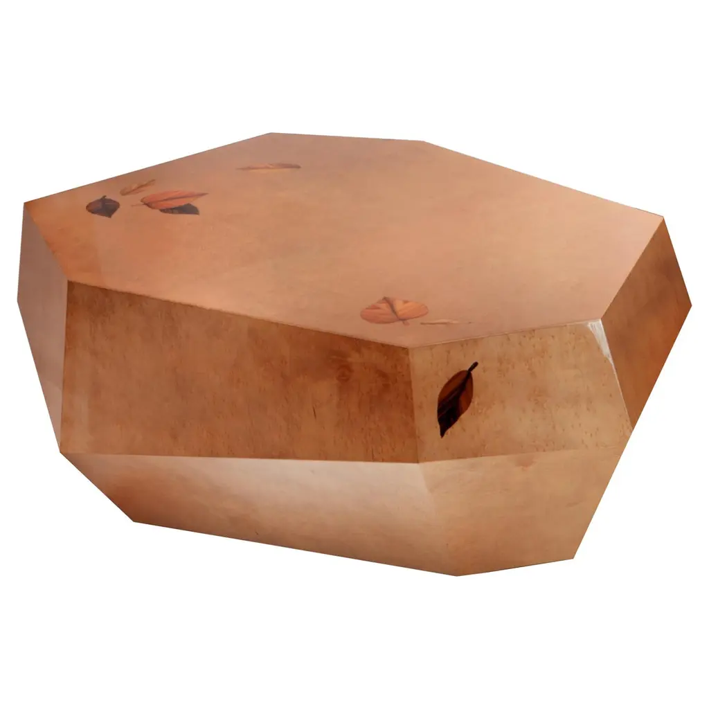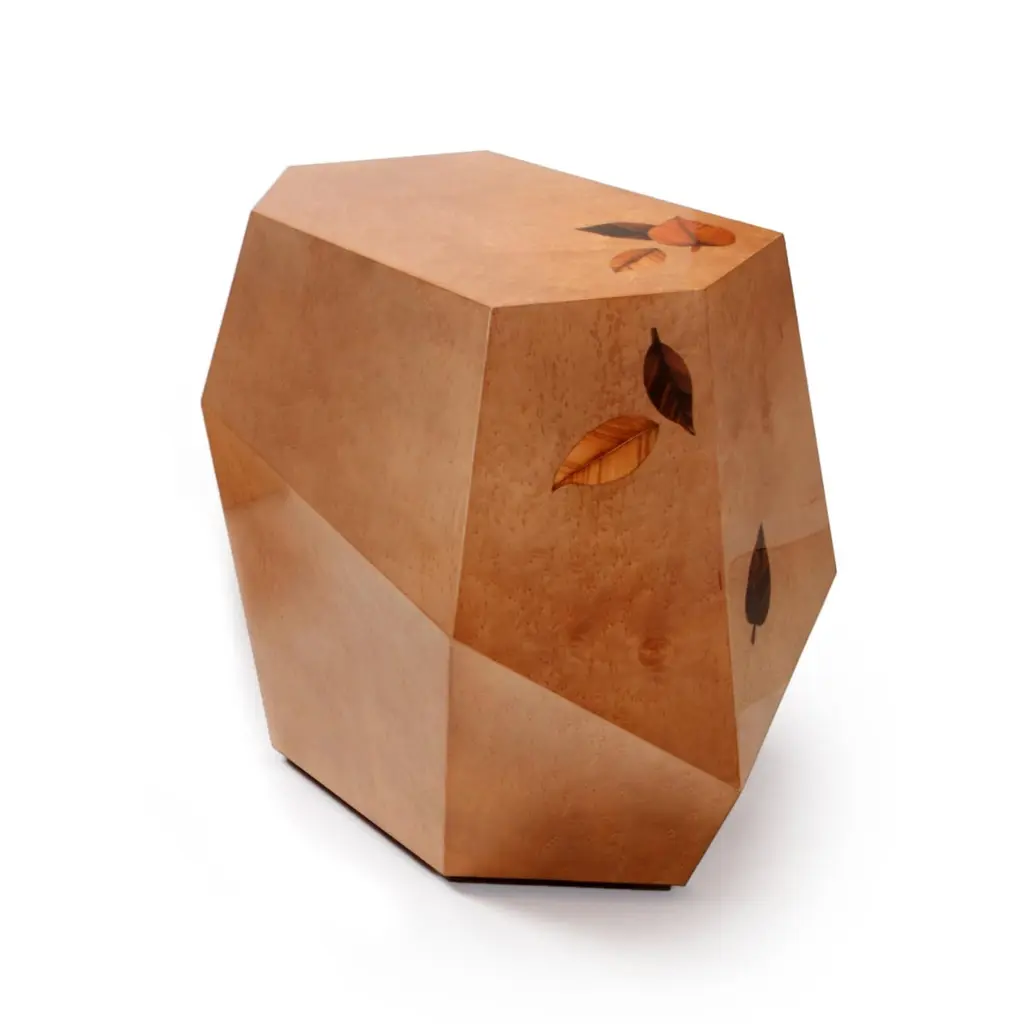 The irregular shapes of the robust volumes of the three rocks tables are finished in smoky brown Birds Eye wood veneer in high gloss varnish. Here is presented the model of the high side table. The small dotted nodules of this veneer resemble the texture of a true rock and the high gloss finish to the lake water, turns the surface almost an exact picture of the idyllic autumnal landscape. The leaves are embedded by the hands of a craftsman with the art of marquetry. The work is performed entirely by hand with wisdom and perfection.These tables are highly customized designs that can be produced in a wide variety of materials and finishes such as lacquered, wood veneers, gold, silver and copper leaf, as well as fully covered by glass and mirror options.Product detailsWood structure with marquetry work in smoky brown bird’s eye, rosewood, ebony and olive tree veneers in high gloss.Product optionsOther veneers, natural, aged or degrade gold/silver/copper leaf or any Ral Classic color finished in matte, half gloss or high gloss varnish.Lined with normal/bronze/aged mirror or white/black lacquered glass.Weight 7Kg 15.5 lbs Made to order. Other finishes are available under request.Designed by Joana Santos Barbosa for InsidherLand, 2013. Handmade in Portugal.