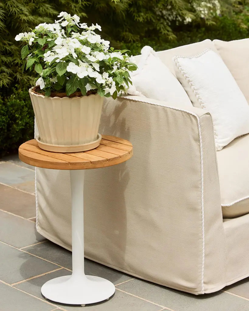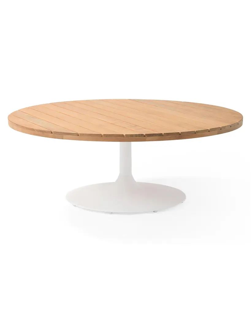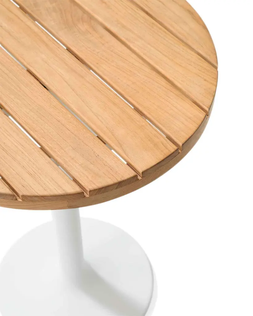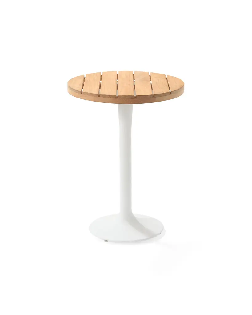 Modern in shape. Sustainably-sourced Grade A Teak slats top a pedestal, powder-coated aluminum base. Made to brave the elements.