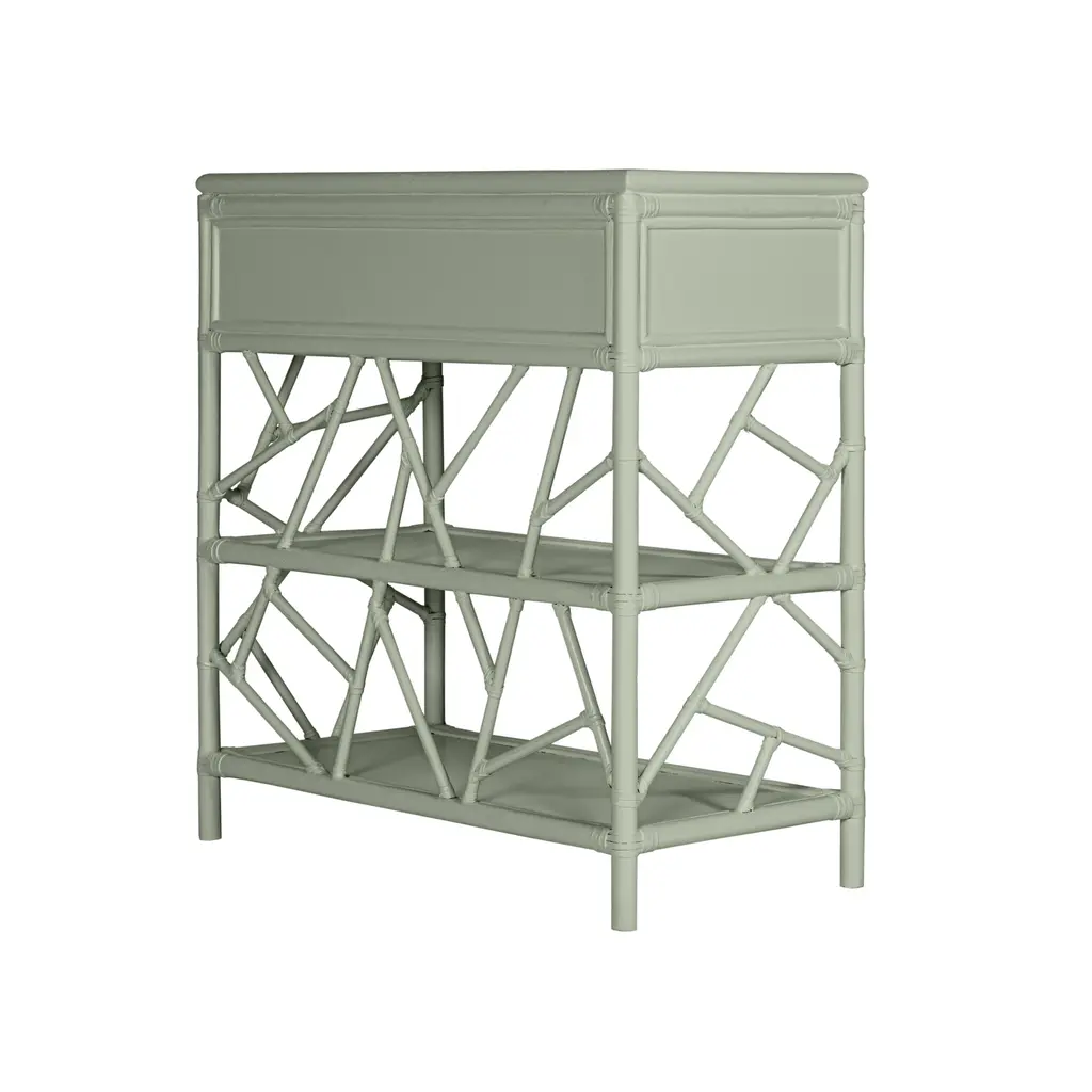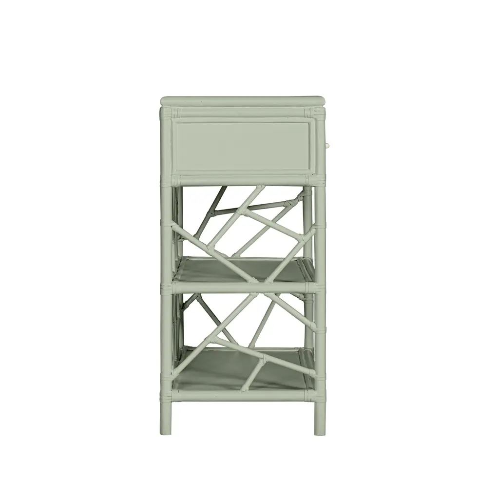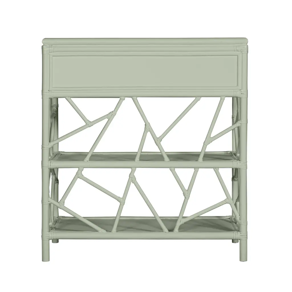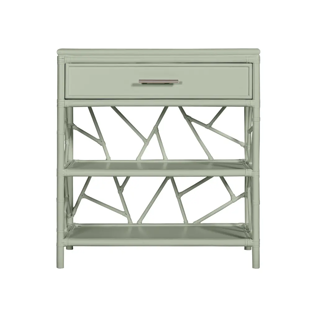 Enhance your space with the chic Tiffany End Table! Crafted from a rattan frame and leather bindings, this piece seamlessly blends sustainability and style. Its bold geometric design adds a contemporary touch to any room, while the drawer and two open shelves provide the perfect amount of storage. The Tiffany End Table is the ideal choice for those looking to combine fashion and practicality in their décor.