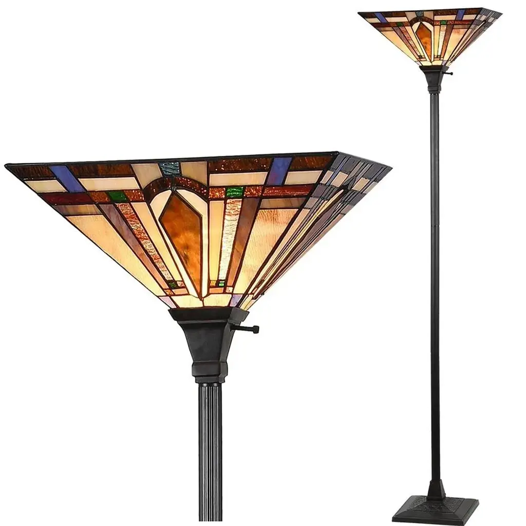 Tiffany Torchiere Floor Lamp Mission Style Stained Glass Shade 12" Standing Corner Torch Uplight Lamps 69" Tall Vintage Reading Light Fixture for Living Room Bedroom Office Features Features Handcraft Tiffany Floor Lamp - Qiounlse vintage torchiere floor lamp is well heavy duty constructed , real handmade stained glass lampshade, the shade is wide 12inches, 69 inches tall, the lampshade is multi-color , metal pole, resin base, vintage atmosphere or a bohemian touch. Easy to assemble- The tiffany torch floor lamp is very easy to put up together , not more than 5 miniutes. It is the perfect light for bedrooms and living rooms or home office, as it's gorgeous enough to provide soft warm lighting and a warm cozy ambiance Elegant Corner Floor Lamp - You can put this antique reading lamp under your sofa or narrow corners. making each one a unique and stunning centrepiece to place in your to the love seats, sofa, TV, fish tank armchairs, side tables, bedsides and more places. Bulbs Information- Need 1 bulb( bulb not included), max 60W , E26base, ON/OFF rotary switch on the top, recommended bulb CFL, incandescent bulb or LED warm white light bulb, different light bulbs get different looking. Tiffany Torch Floor Lamp Stained Glass Light Fixture Specifications: Dimension: L12" x W12" x H69" Stained Glass shade size 12x 12 inches, Resin Base Sise:10.2"x10.2" Cord /wire line 69" length, Bulb: 1x 60W (max) E26 bulb (Bulb not included), ON/OFF rotary switch Bulbs can be used CFL, incandescent bulb or LED warm white light bulbs Color: Blue & Yellow for Stained Glass Shade, Bronze Pole and Base