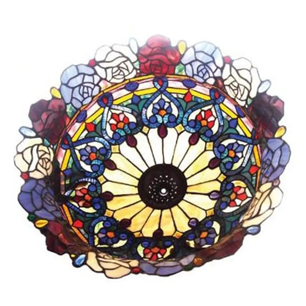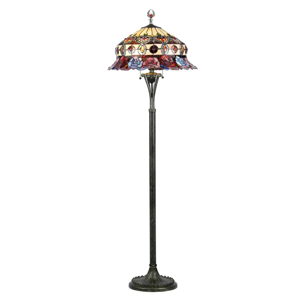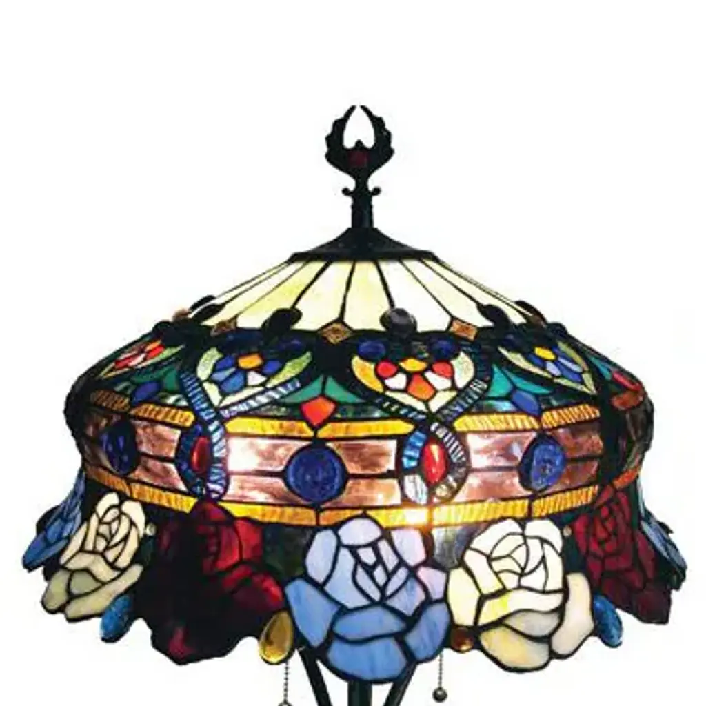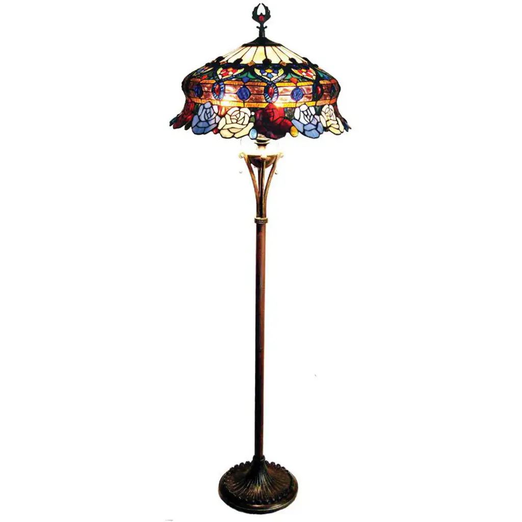 Bring an exotic influence into your living room with this three-light floor lamp. This lamp features a Tiffany-style shade that illuminates your space with multiple colors. A convenient pull chain switch makes this floor lamp suitable for placement next to your sofa or side table.Illuminate your home decor in an array of bright colors with this Tiffany-style floor lampLighting features a rose design in shades of blue, red, white, beige and goldHandmade lamp comes with an elegant base in a bronze finishMade of plated steel, glass and electrical componentsComes with a pull chain switchUL approvedRequires three (3) 60-watt medium base bulbs (not included)Measures 63 inches high x 20 inches in diameter