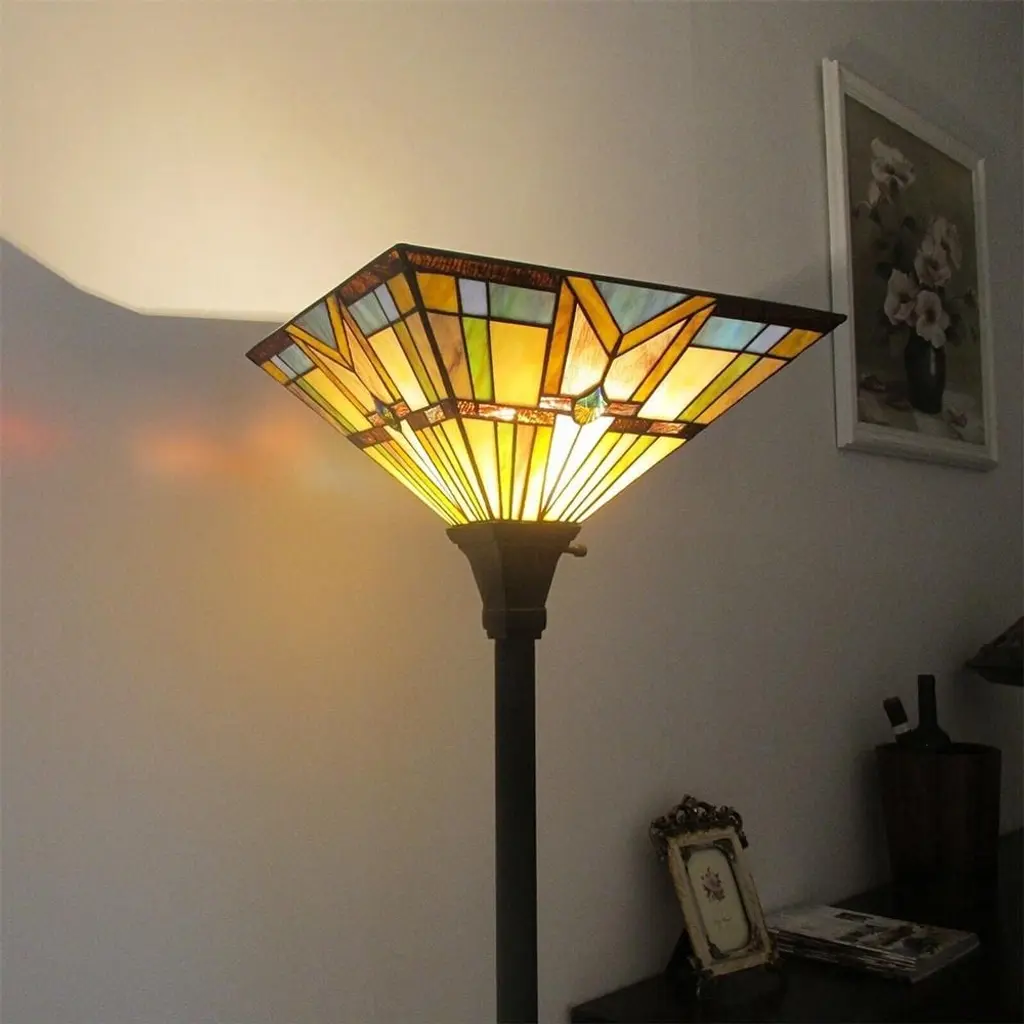 Features Features Handcraft Tiffany Floor Lamp - Qiounlse vintage torchiere floor lamp is well heavy duty constructed , real handmade stained glass lampshade, the shade is wide 12inches, 69 inches tall, the lampshade is multi-color , metal pole, resin base, vintage atmosphere or a bohemian touch. Easy to assemble- The tiffany torch floor lamp is very easy to put up together , not more than 5 miniutes. It is the perfect light for bedrooms and living rooms or home office, as it's gorgeous enough to provide soft warm lighting and a warm cozy ambiance Elegant Corner Floor Lamp - You can put this antique reading lamp under your sofa or narrow corners. making each one a unique and stunning centrepiece to place in your to the love seats, sofa, TV, fish tank armchairs, side tables, bedsides and more places. Bulbs Information- Need 1 bulb( bulb not included), max 60W , E26base, ON/OFF rotary switch on the top, recommended bulb CFL, incandescent bulb or LED warm white light bulb, different light bulbs get different looking. Tiffany Torch Floor Lamp Stained Glass Light Fixture Specifications: Dimension: L12" x W12" x H69" Stained Glass shade size 12x 12 inches, Resin Base Sise:10.2"x10.2" Cord /wire line 69" length, Bulb: 1x 60W (max) E26 bulb (Bulb not included), ON/OFF rotary switch Bulbs can be used CFL, incandescent bulb or LED warm white light bulbs Color: Blue & Yellow for Stained Glass Shade, Bronze Pole and Base