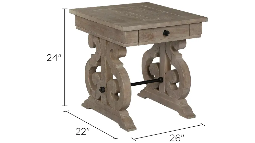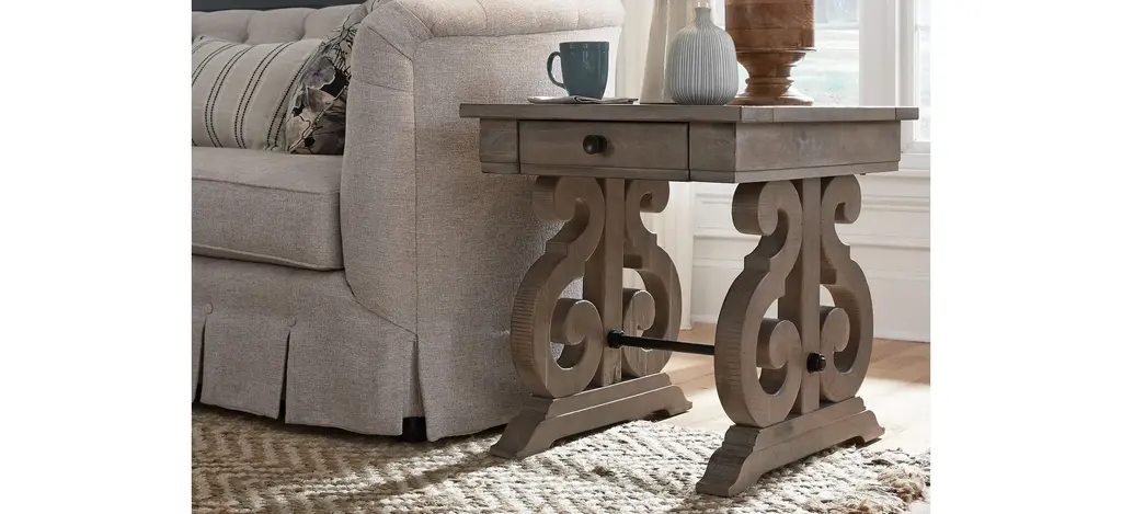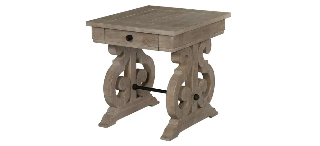 Bring Old World charm home with the Tinley Park rectangular end table. Gracious S-curved carved bases support overlaid solid pine tops finished in vintage inspired dovetail gray pine. Weathered Bronze metal stretchers and hardware create the perfect accent to set the mood for stunning European influenced elegance.