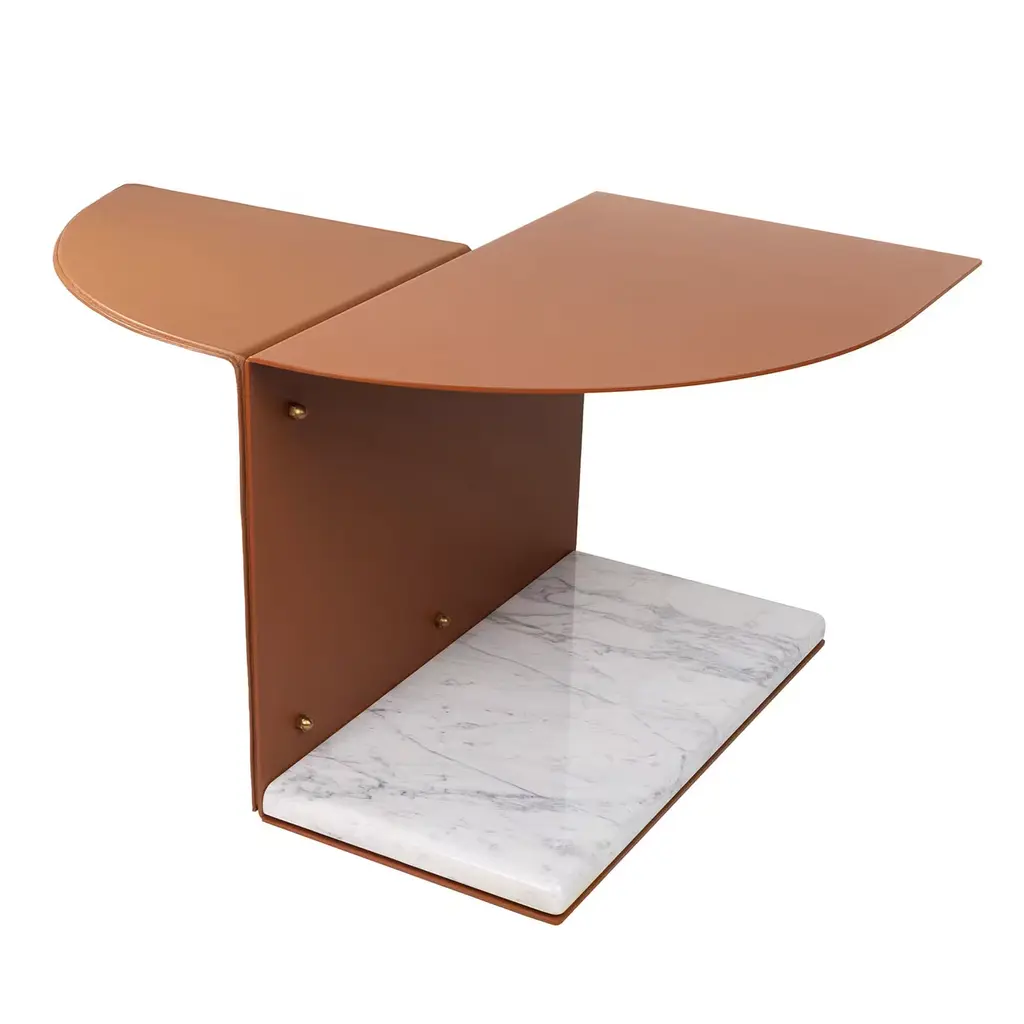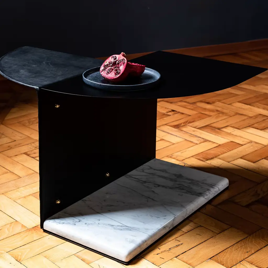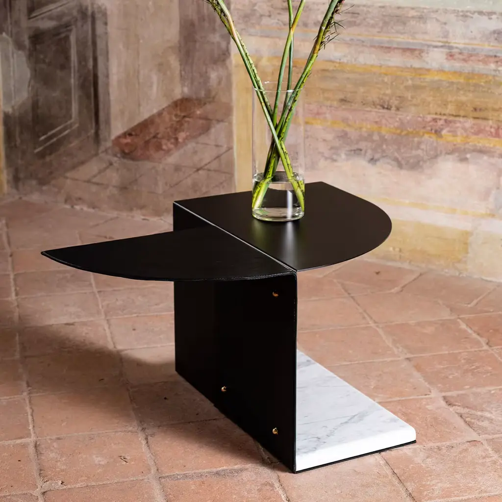 The Tito Side Table presents a harmonious blend of artistry and functionality, designed to evoke a sense of balance and refined elegance. Inspired by themes of self-discovery and equilibrium, its graceful, wing-like silhouette draws the eye while offering both visual lightness and structural stability. The structure is composed of two precision-crafted iron plates, one finished in sleek black lacquer, the other wrapped in fine black bovine leather. The base, in pristine white Carrara marble with softly rounded edges, enhances the table’s sculptural presence. Upon request, a striking jet-black flamed and absolute black granite base is also available. Each table is the result of meticulous manual craftsmanship, ensuring that every piece is entirely unique. Customization options include a curated selection of exclusive leather types and colors. Please contact the Concierge for more information.