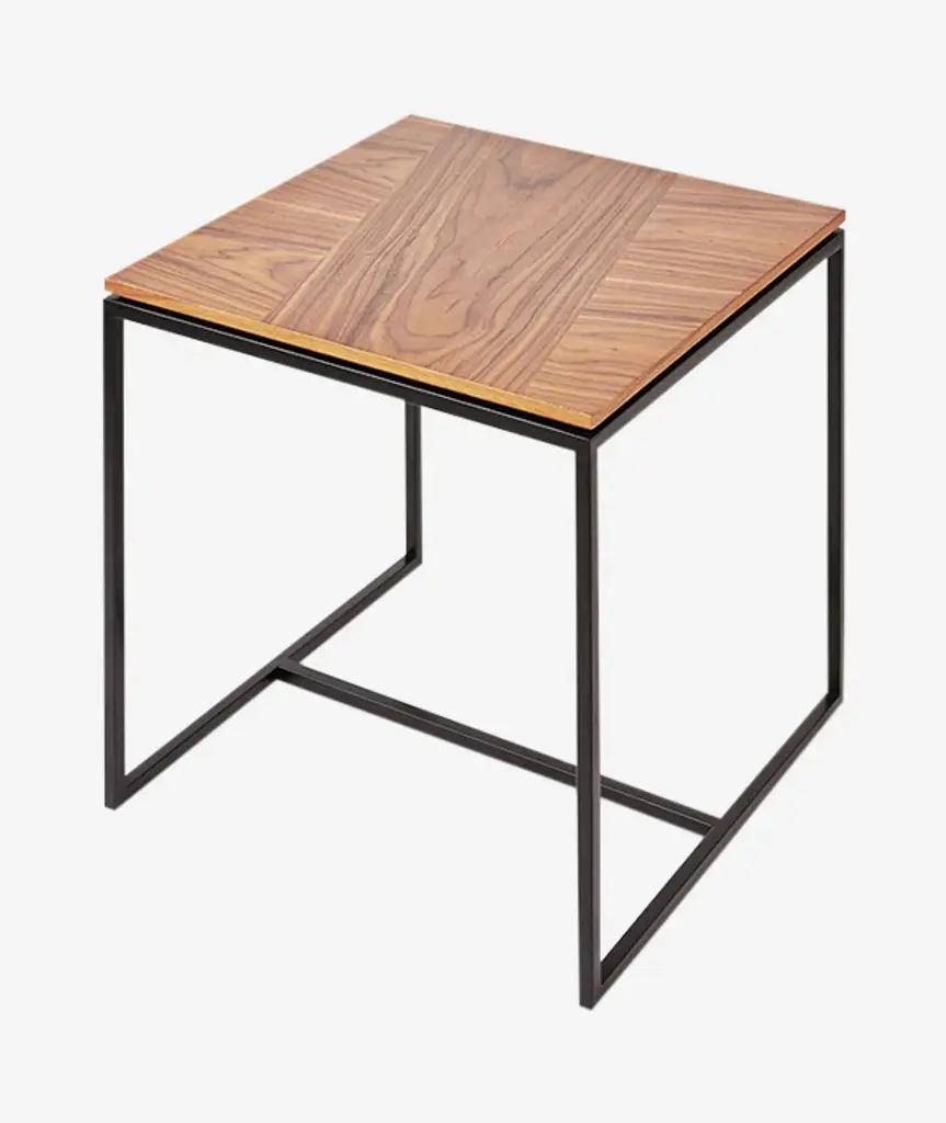 The Tobias End Table is a minimalist, geometric accent piece well suited for modern spaces. The square top features a dynamic arrangement of walnut wood grain panels, which rest on a slim, solid steel base. A subtle reveal along the table edge creates the illusion of a floating top.