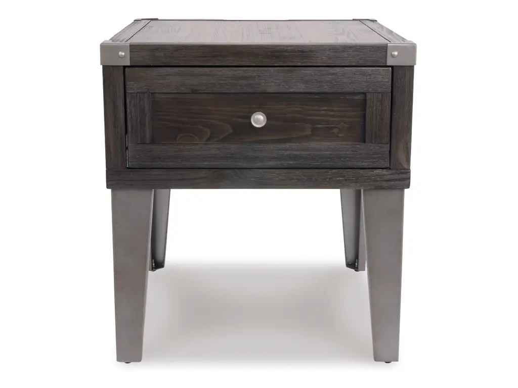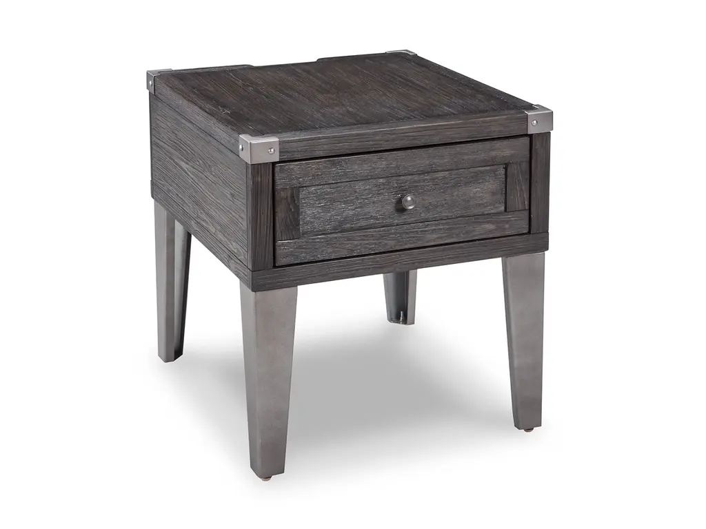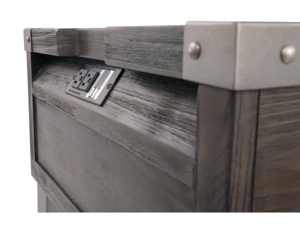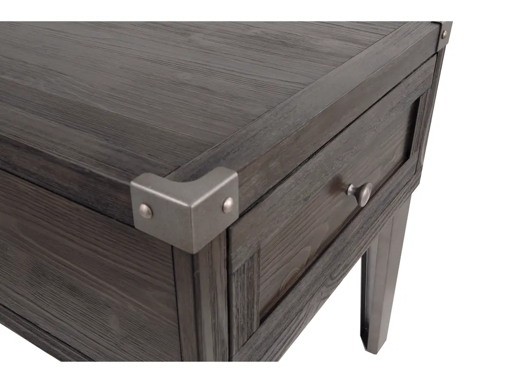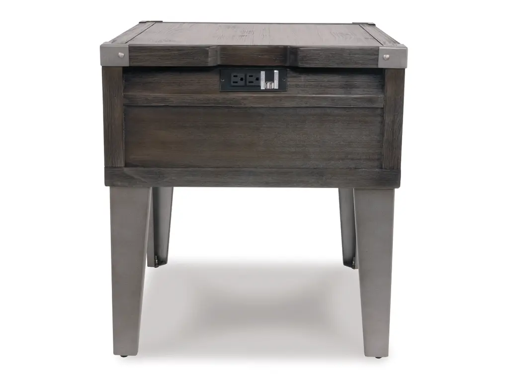 Take a stance for rustic-industrial style with this mixed material end table. Weather-washed pine wood and veneers are contrasted with canted metal legs and corner bracket accents for a uniquely chic merger of earthy beauty and contemporary flair. Power plug-ins and USB charging ports mounted on the back add practical function to great form.