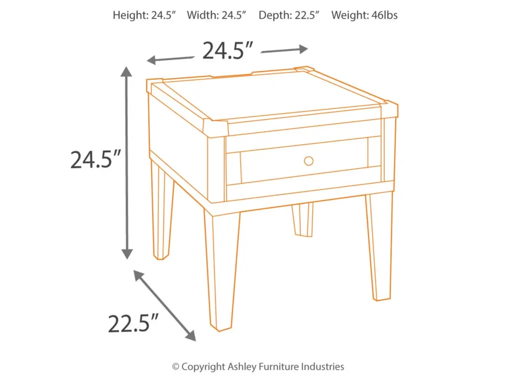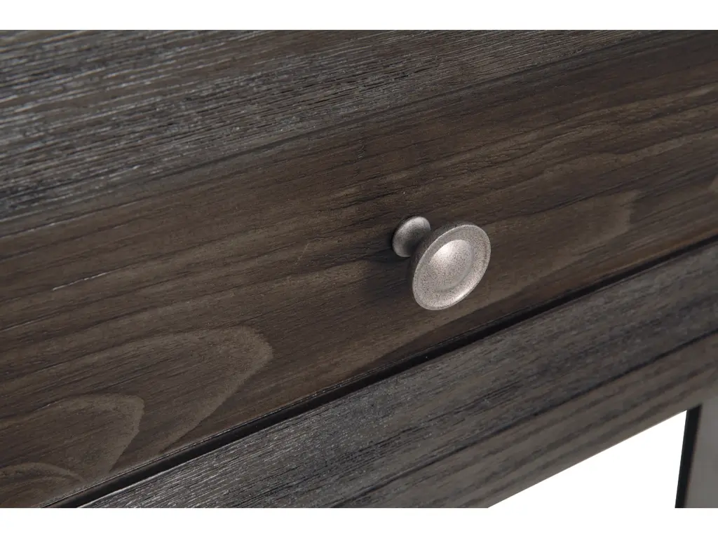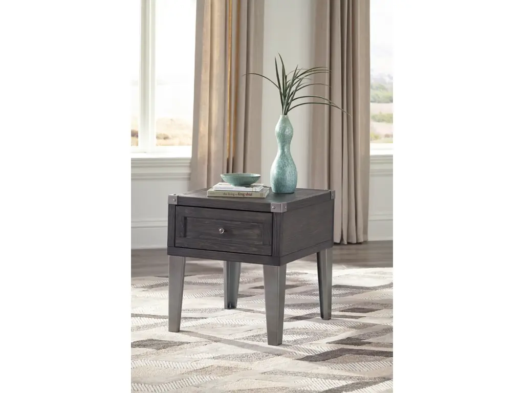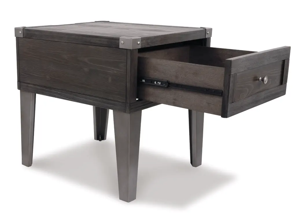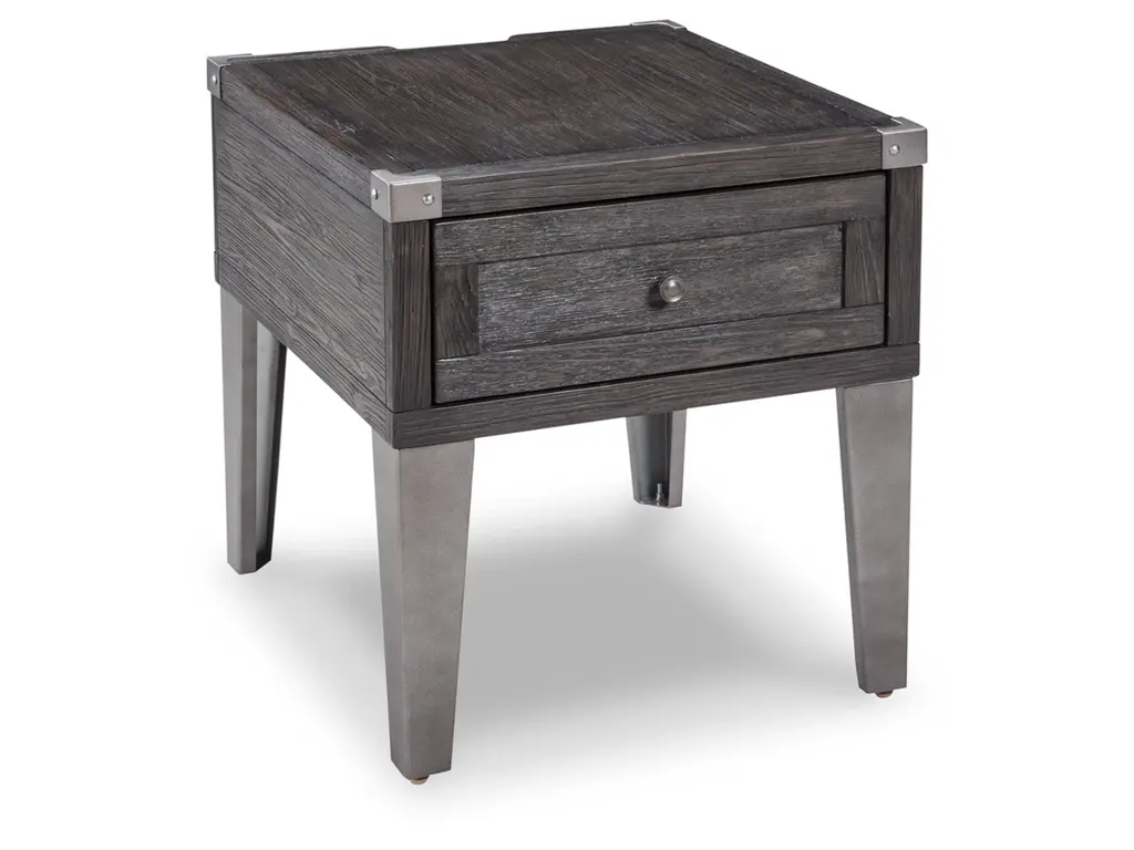 Take a stance for rustic-industrial style with this mixed material end table. Weather-washed pine wood and veneers are contrasted with canted metal legs and corner bracket accents for a uniquely chic merger of earthy beauty and contemporary flair. Power plug-ins and USB charging ports mounted on the back add practical function to great form.