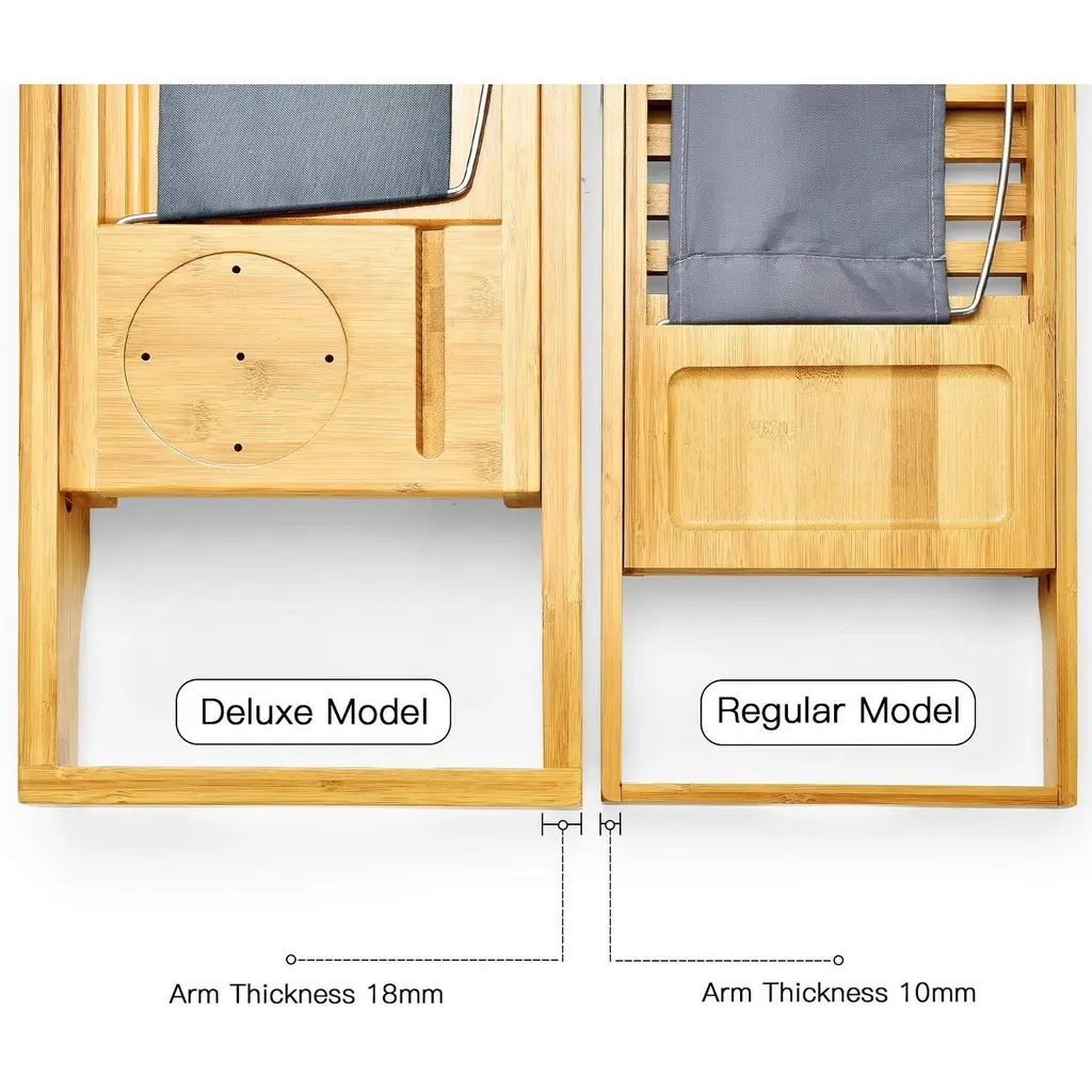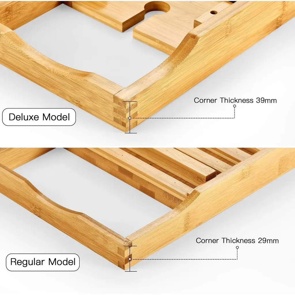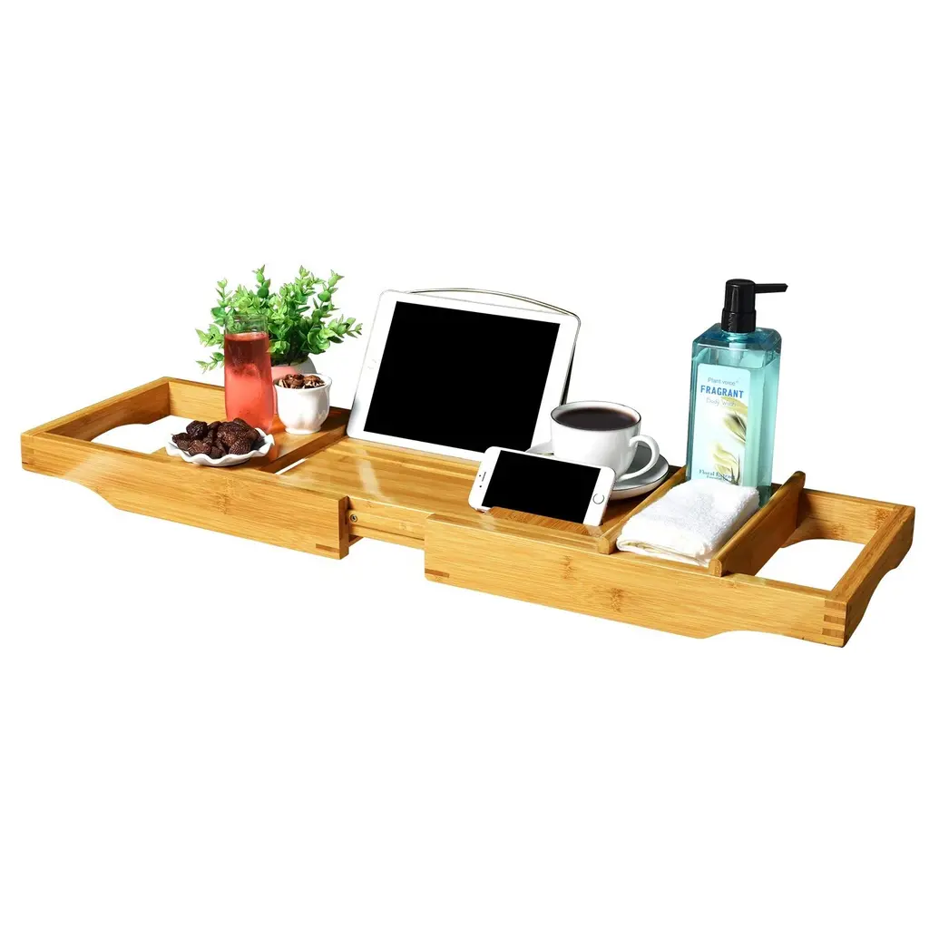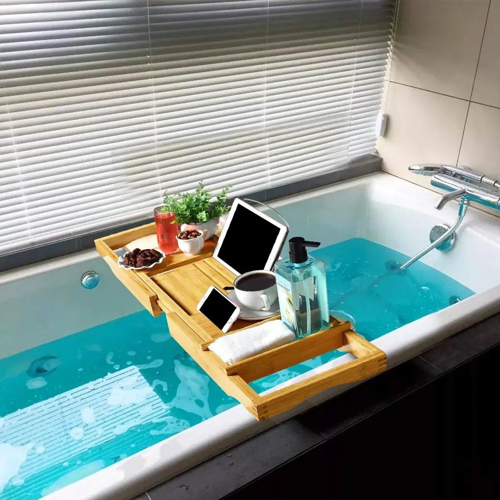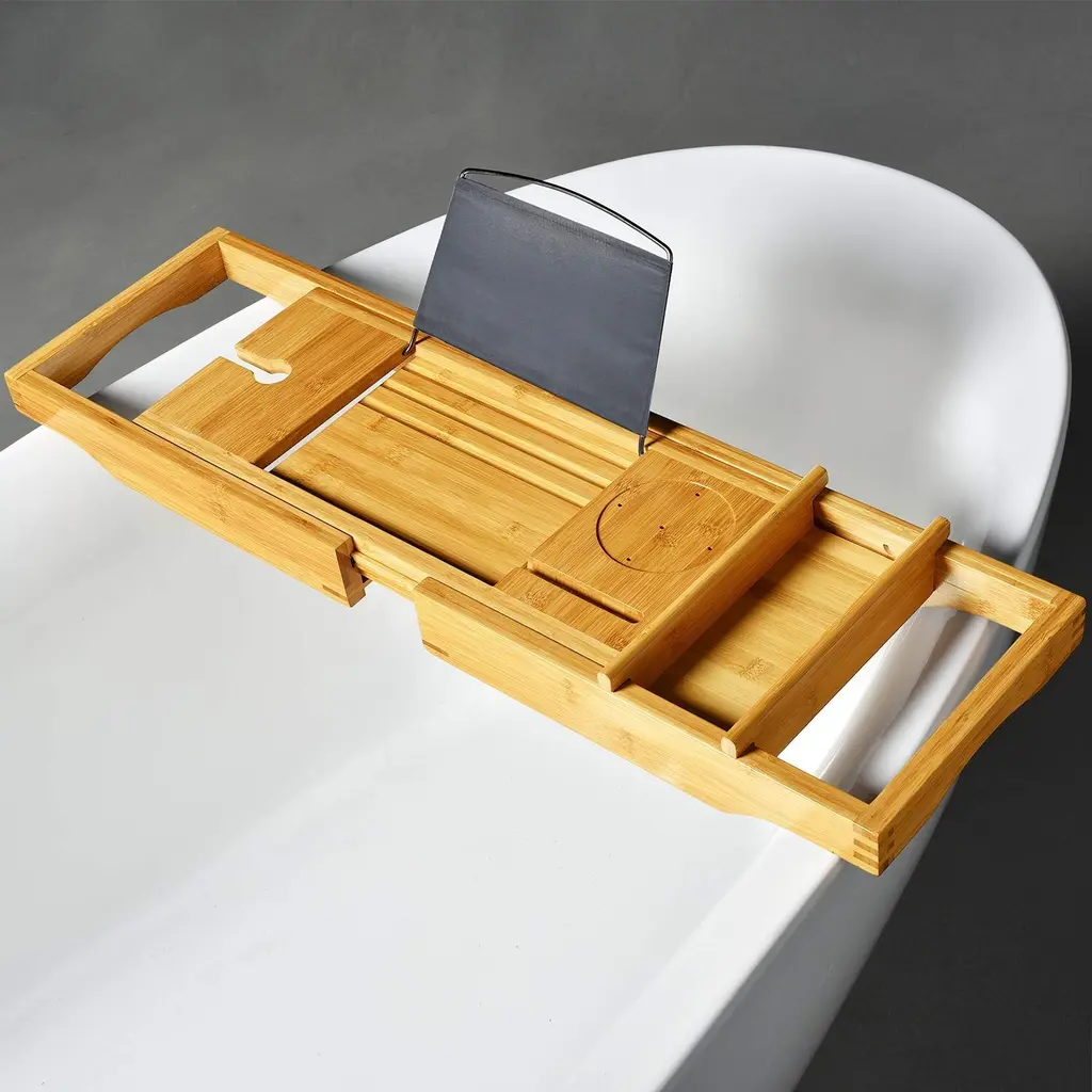 Natural Bamboo ConstructionThis luxury bath caddy is made of natural, high quality & durable bamboo for required durability, water-resistance & long-lasting use. Bamboo is a sustainable option compared to wood, making this caddy safe for the environment too.it is decorated with meatal accents that give it a trendy and modern look. This bath caddy is as stylish as it is funtional.Fits Most Bathtub Sizes:This caddy measures 41.25 inches when open and is designed to fit most bathtubs. The tray can slide to fit your bathtub. It is designed to fold down for space-saving storage when not in use. It measures 27.5 inches when long closed.Great Gift:This bath caddy is an appreciable and functional gift for a new house owner or for your significant half. The eye-catching design and incredible versatility of this caddy makes it the perfect housewarming, birthday, or anniversary gift that will enhance everyone's bathing experience.Keep Everything Safe, Dry & within Reachwhile unwinding after a long day at work, the last thing you want is your phone or the book you are reading alling in the bathtub. But with ToiletTree Products Bathtub Caddy, you can have a relaxing,luxurious & spa-like bathing experience without worrying about your things getting wet. You can read a book while sipping wine and enjoying the fragrance of candles.