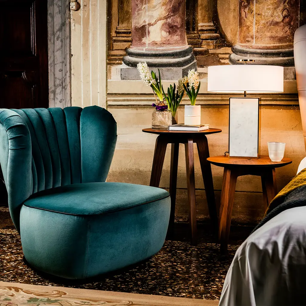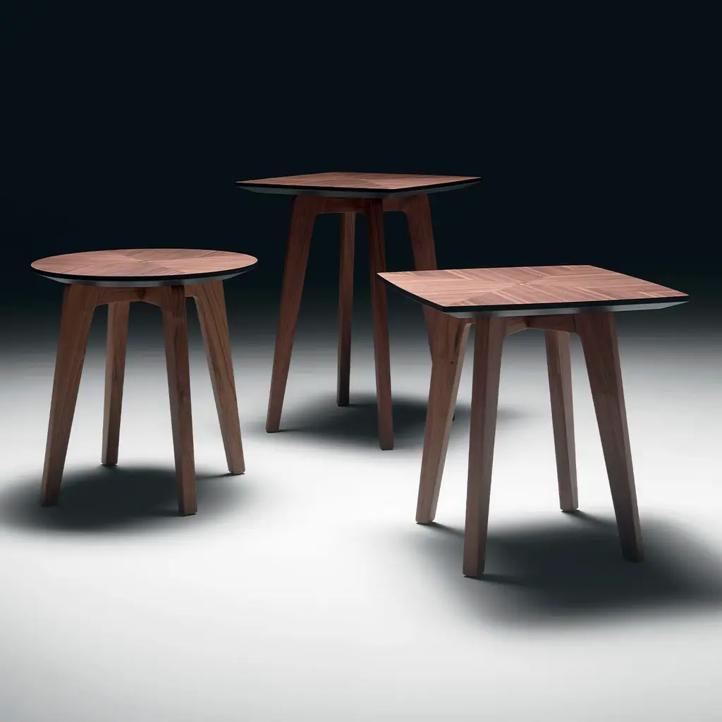 Side tables with supporting structure in Canaletto walnut solid wood. Top in MDF Canaletto walnut finishing with central insert in metal gold finishing.