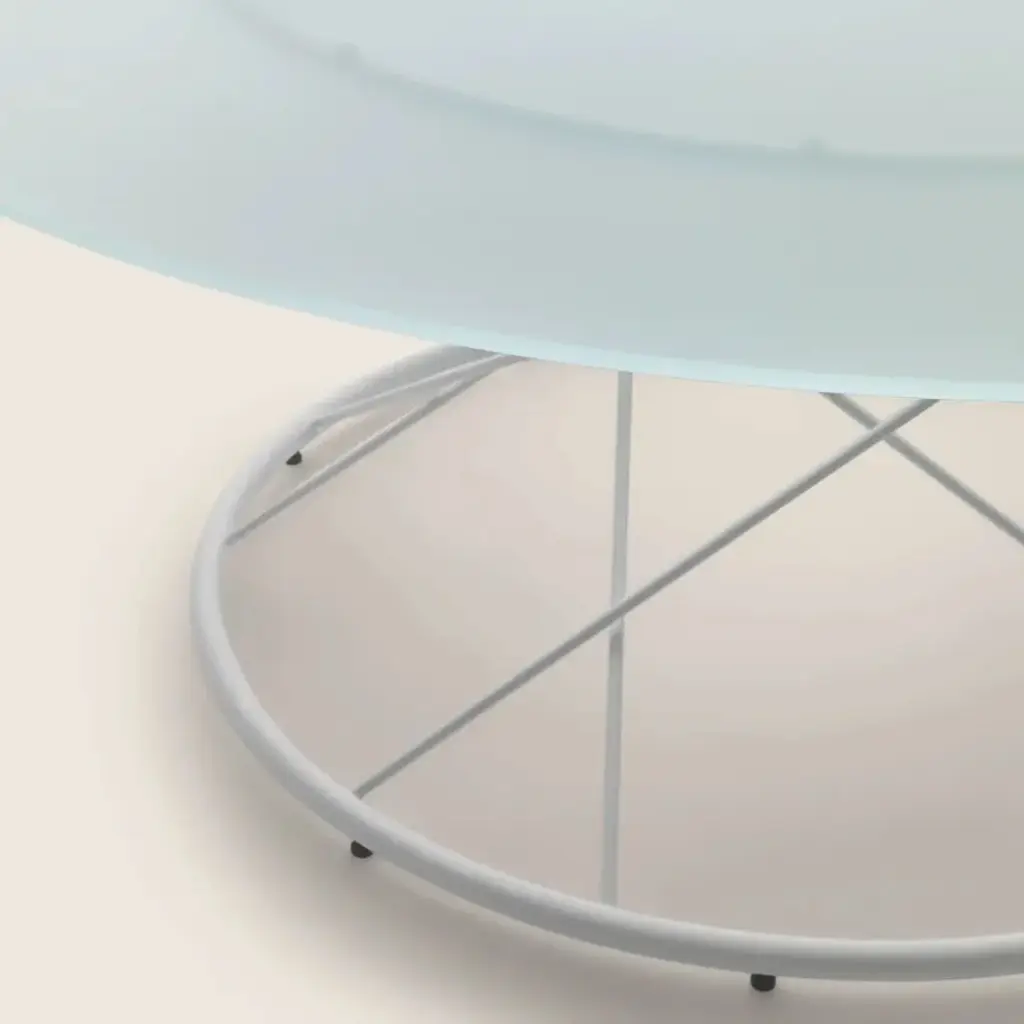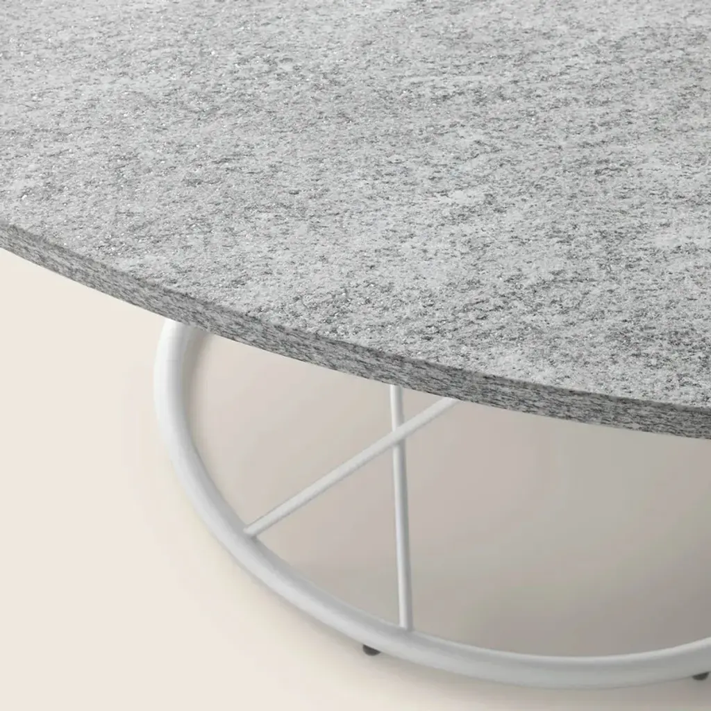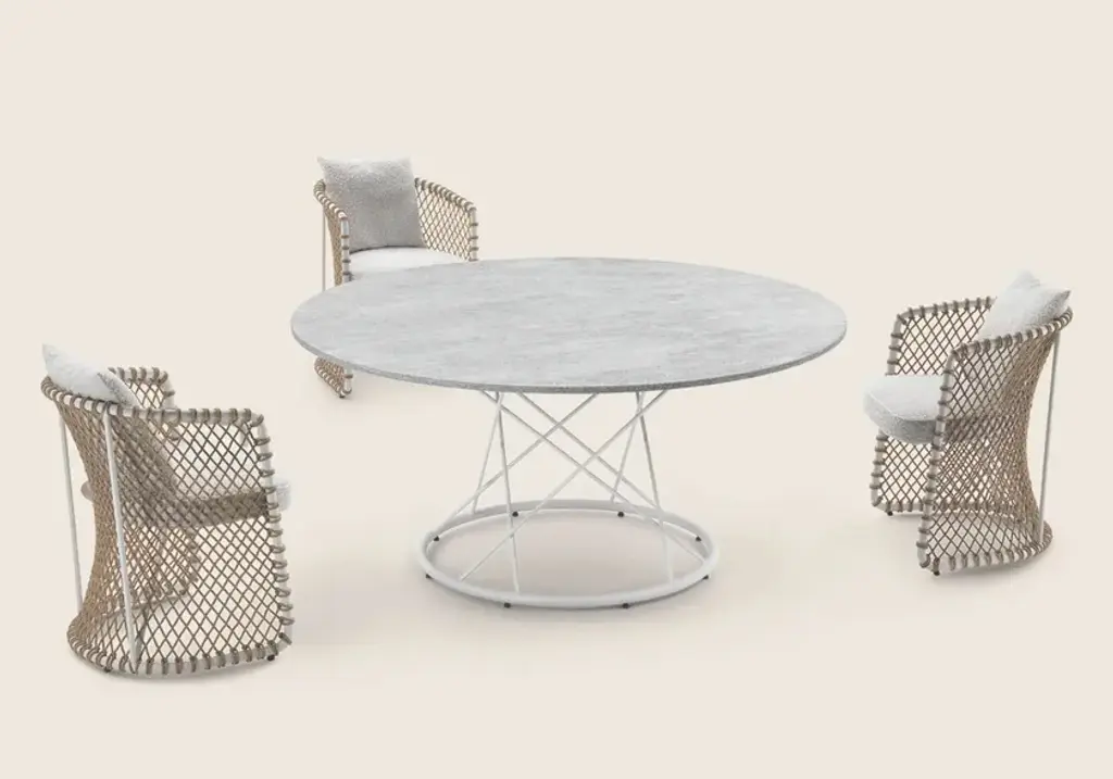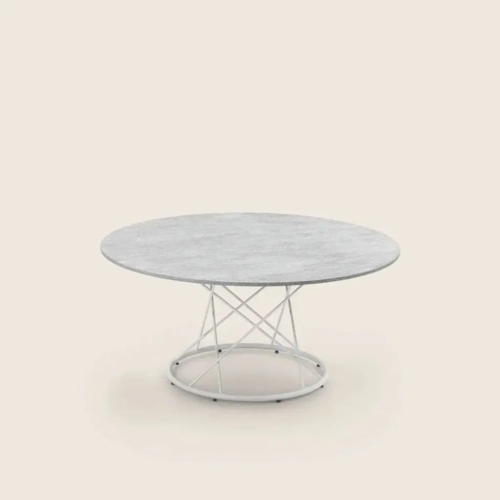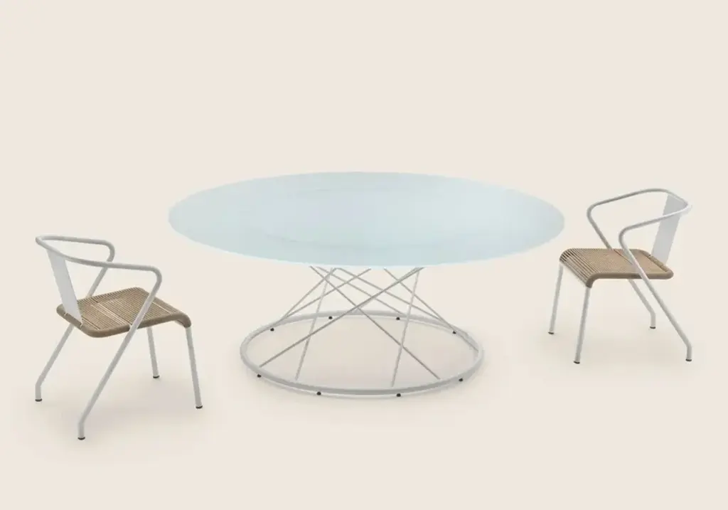 TORCELLO OUTDOOR is a round garden table made of powder-coated steel, available in three sizes.FeaturesTop: in satin-finished tempered glass 2505; or in stone, available in Lavica, Porphyry, Cardoso, and Beola Argentata types. Stone tops feature an underlying support layer in marine-grade plywood.Structure: in stainless steel tubing, oven-painted with epoxy powders in the colors white 100, wine red 405, khaki green 705, burnished, glossy grey 715, matte titanium 710, or in textured finishes: white 300, sand 310, brick 320, sage green 330, terracotta 325, forest green 335, charcoal 350.Feet: resting on adjustable feet made of thermoplastic material.Torcello Outdoor is a collection characterized by a perfect balance between formal elegance and dynamism.The tubular metal structure, powder-coated in a range of sophisticated colors, stands out for the refined interplay of lines in the base, which on one hand provides structural stability, while on the other adds lightness and movement to the composition.The tops of the dining tables, offered in various diameter sizes, range from the transparency of glass to the materiality of stone.For the side tables, the top is exclusively offered in ceramic, available in a range of refined colors.