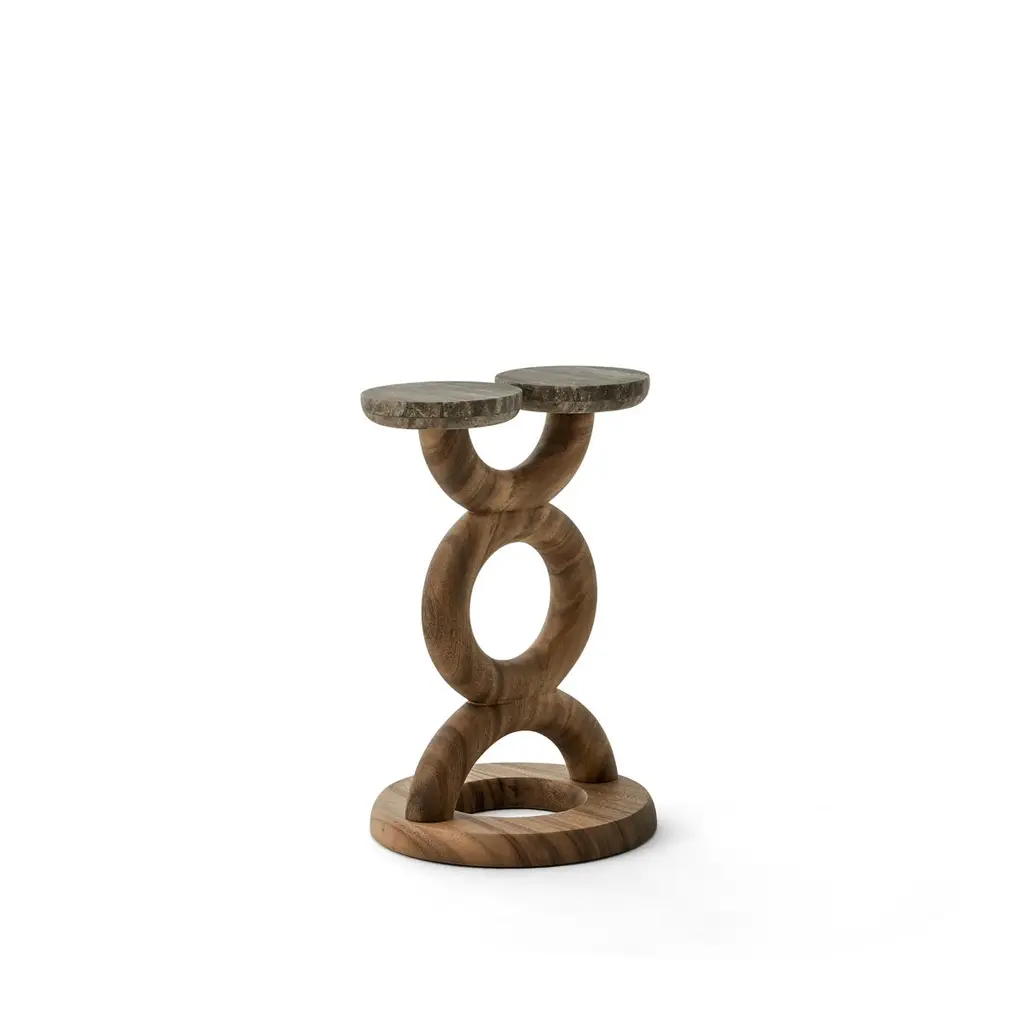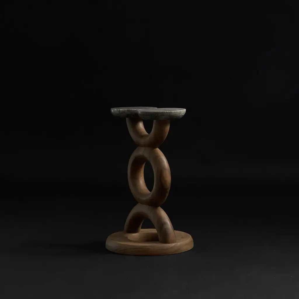 Totem Side Table by DAaZDimensions: D 32.5 x W 35.5 x H 50.5 cm.Materials: Albizzia wood, marble.DAaZ Furniture honors the spirit of adventure. We embrace the escape of the ordinary and revel in the magic that’s found in the unexpected. Our artistic ability shines through in our choice of contrasting designs that challenge conventions, tailor trends, and bring out the creative flair in our customers too. Faced with a treasure trove of choices, you are inspired to walk individual paths leading to the unknown, unveiling new sights, enveloping you in the scent of nostalgia.We bring to your home more than just beautiful design, but unique fragments of life stories. After all, what is your home but a blank canvas on which to celebrate your own journey with the people you love.