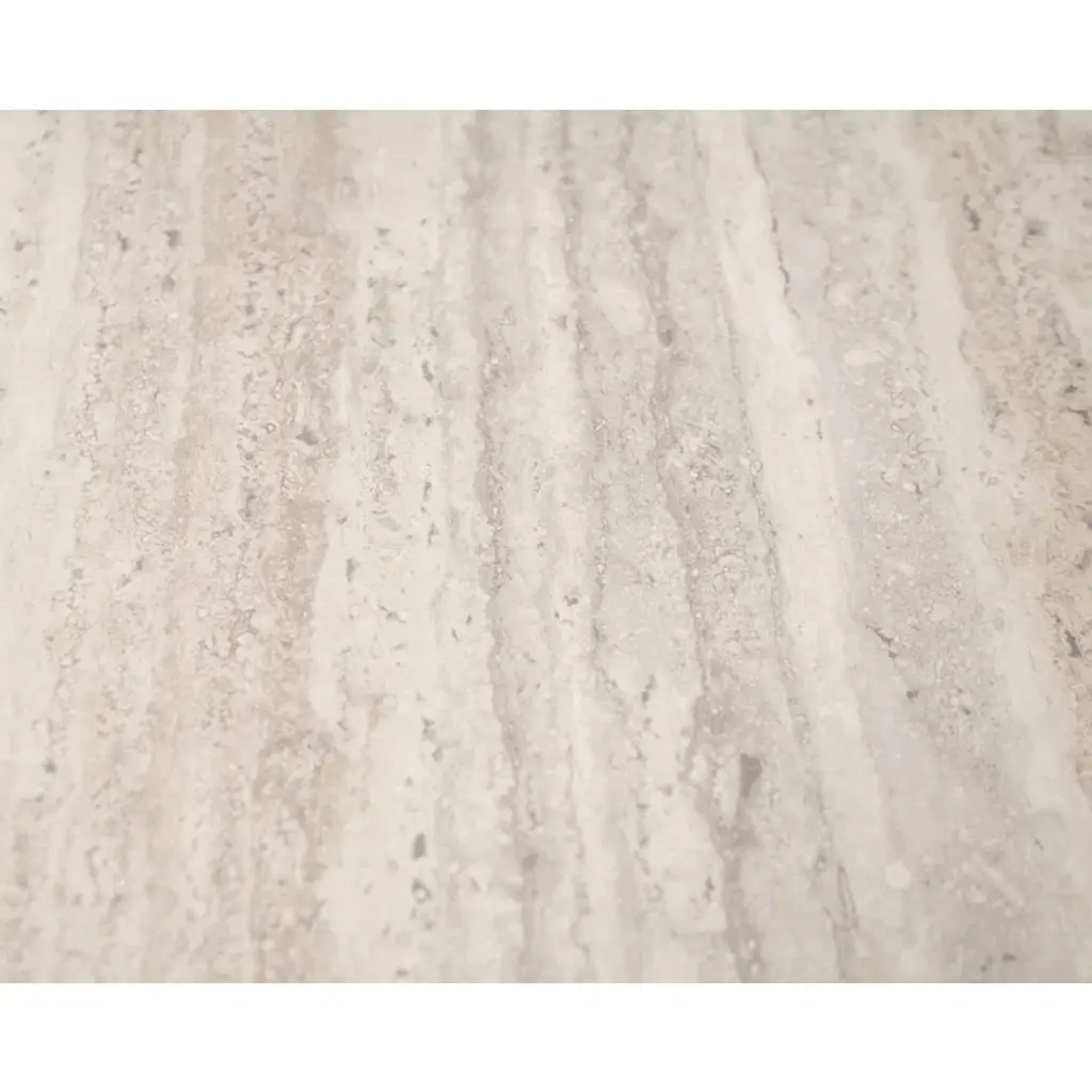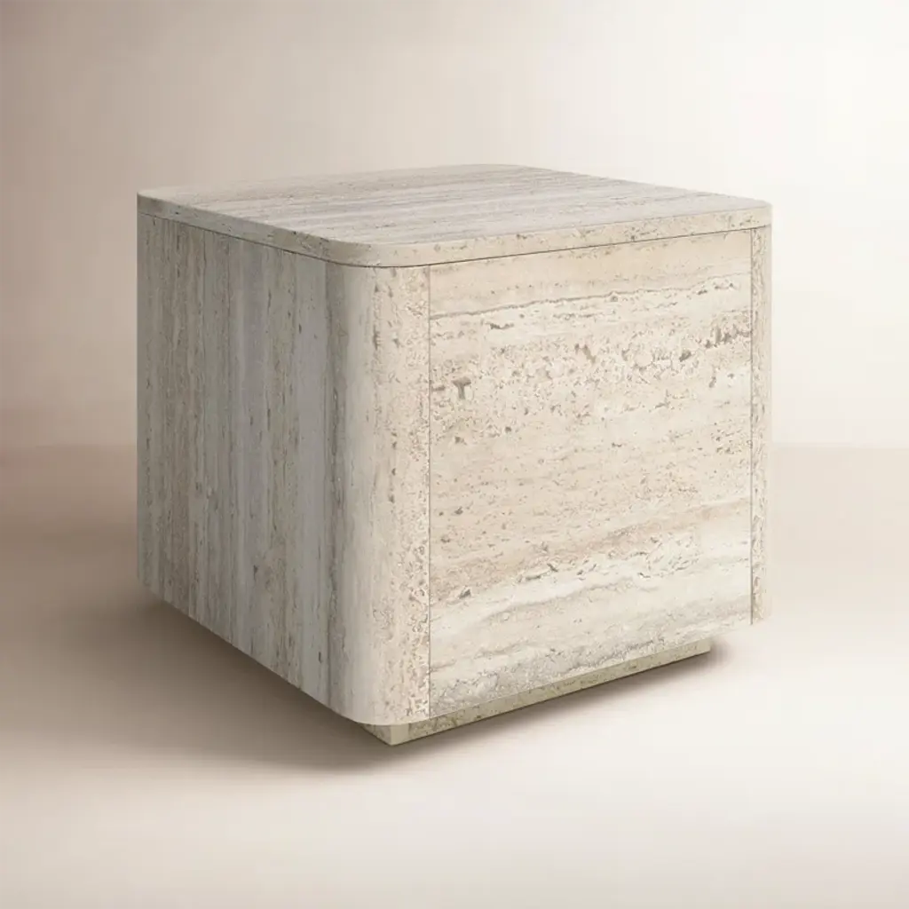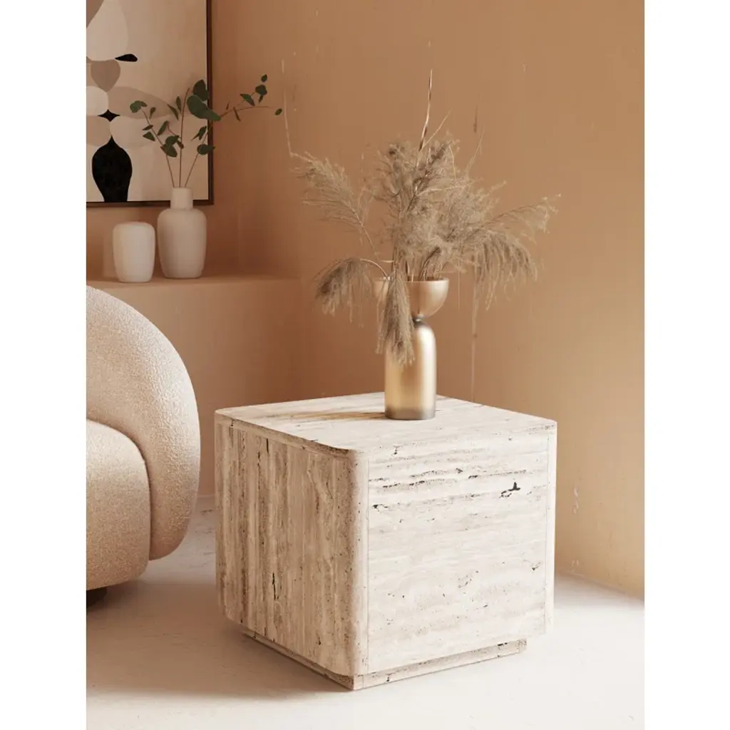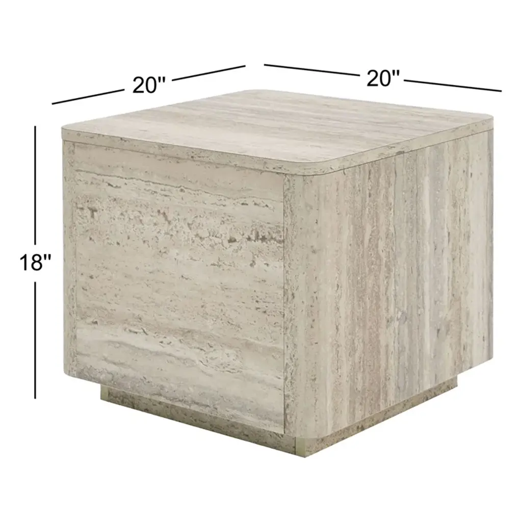 The Totka collection features a stylish, uniform travertine stone finish, creating a sophisticated aesthetic for its pieces. The square end table is a solid singular piece to be placed in the center of your living space, making it both attractive to the eye and functional.